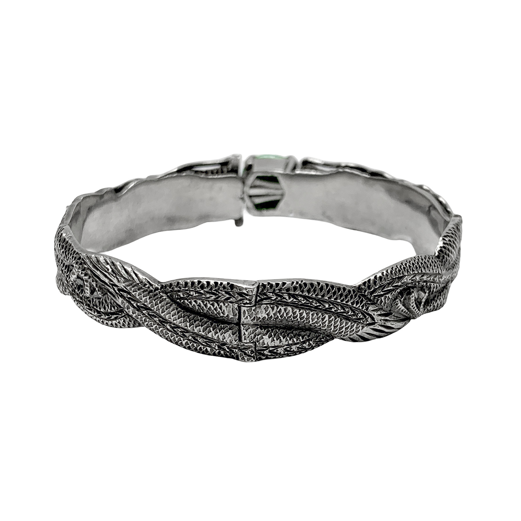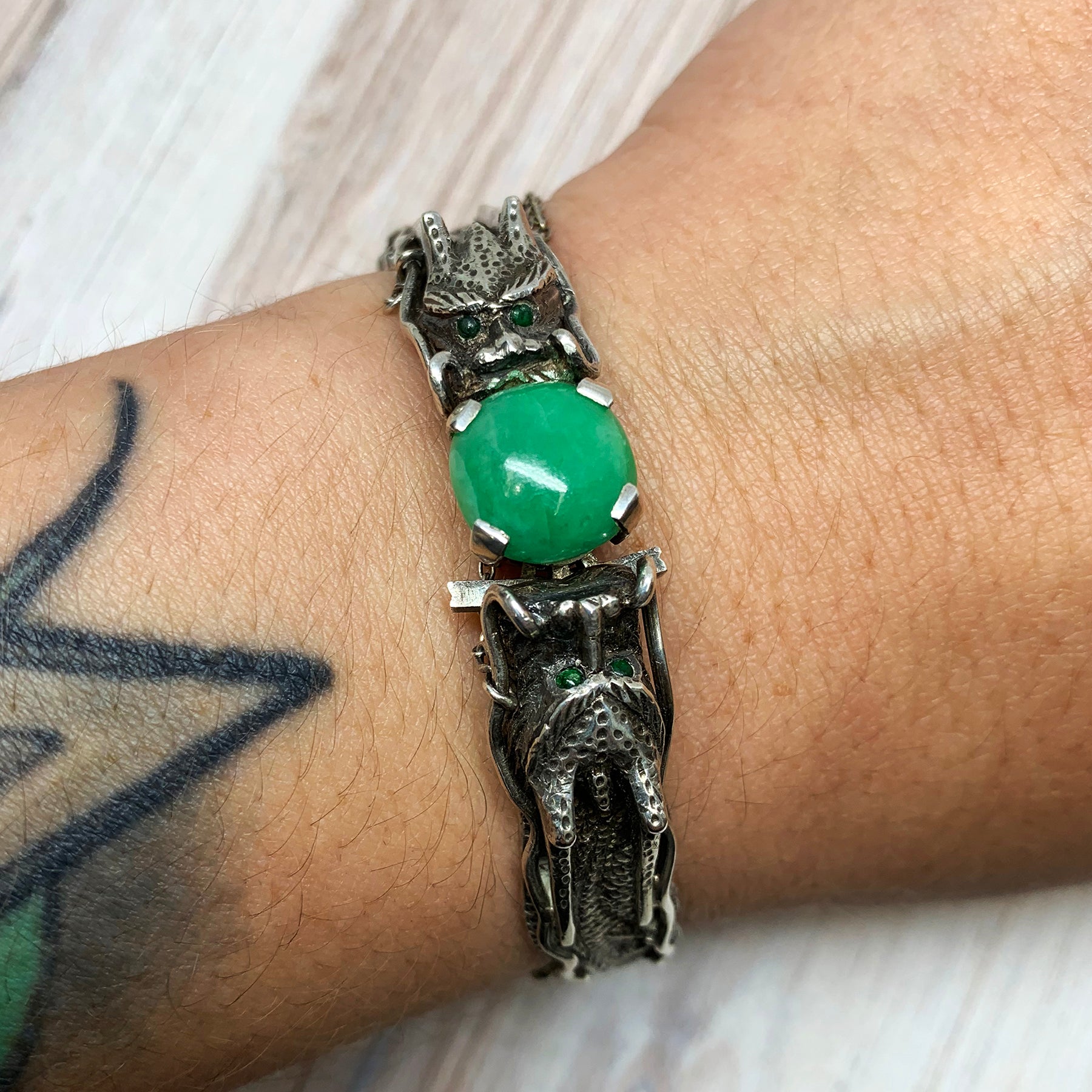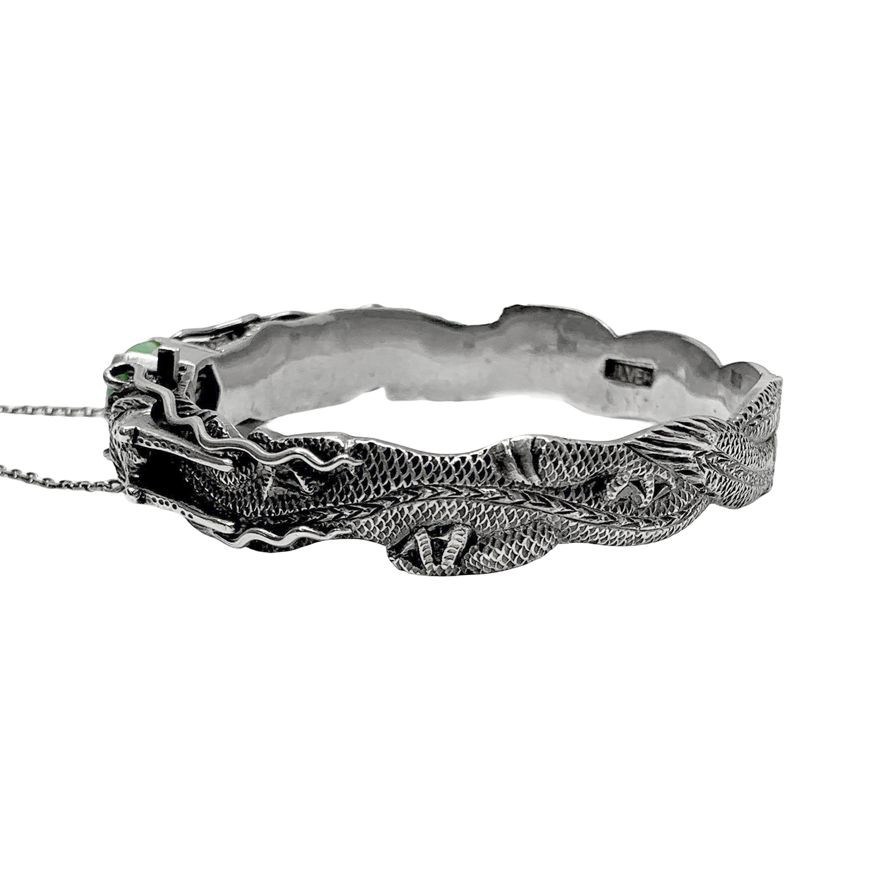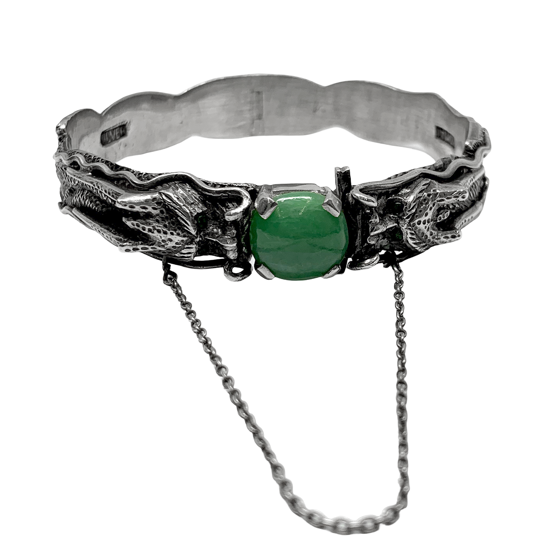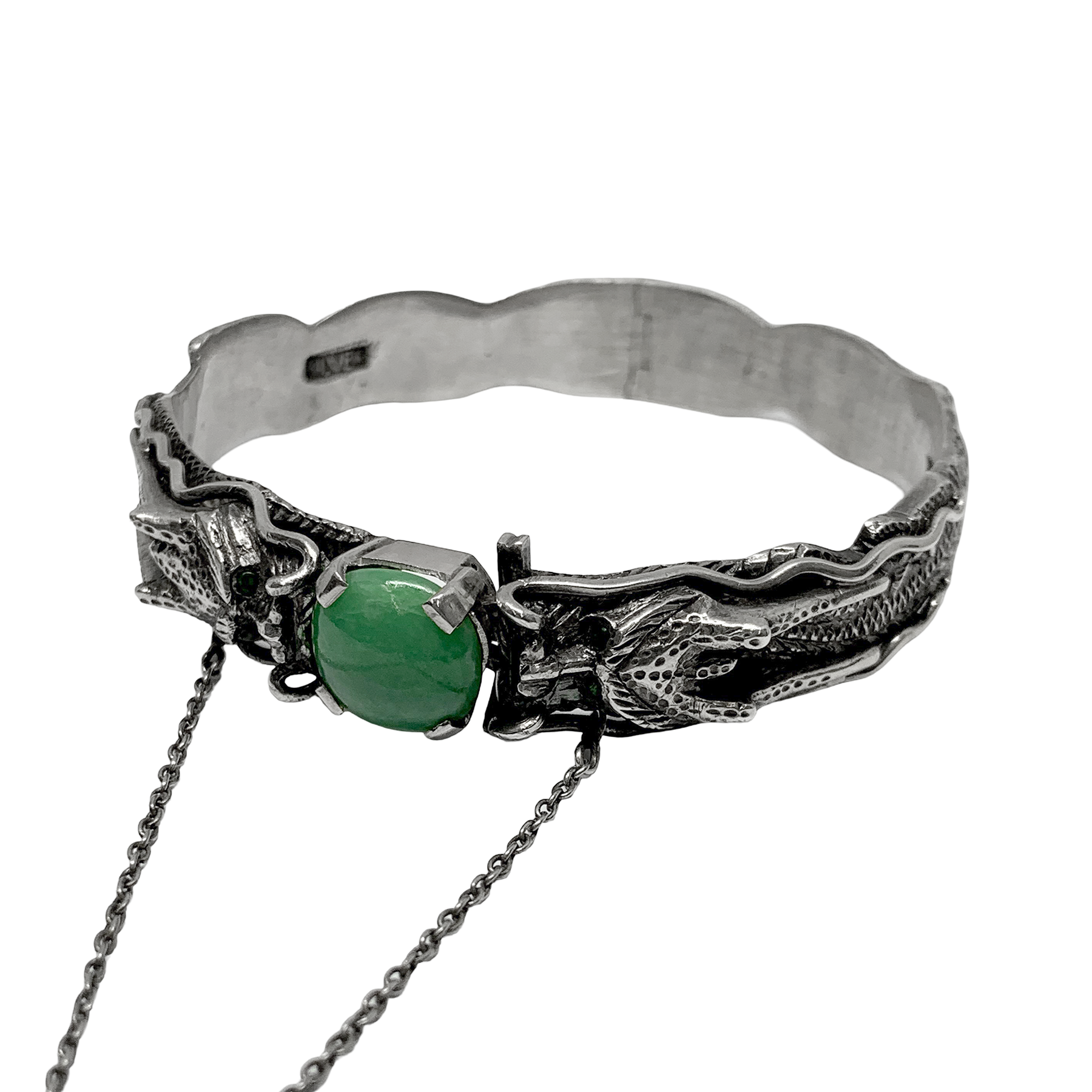 Sterling silver hinged double dragon head bangle with round green Jade cabochon clasp with safety chain.
