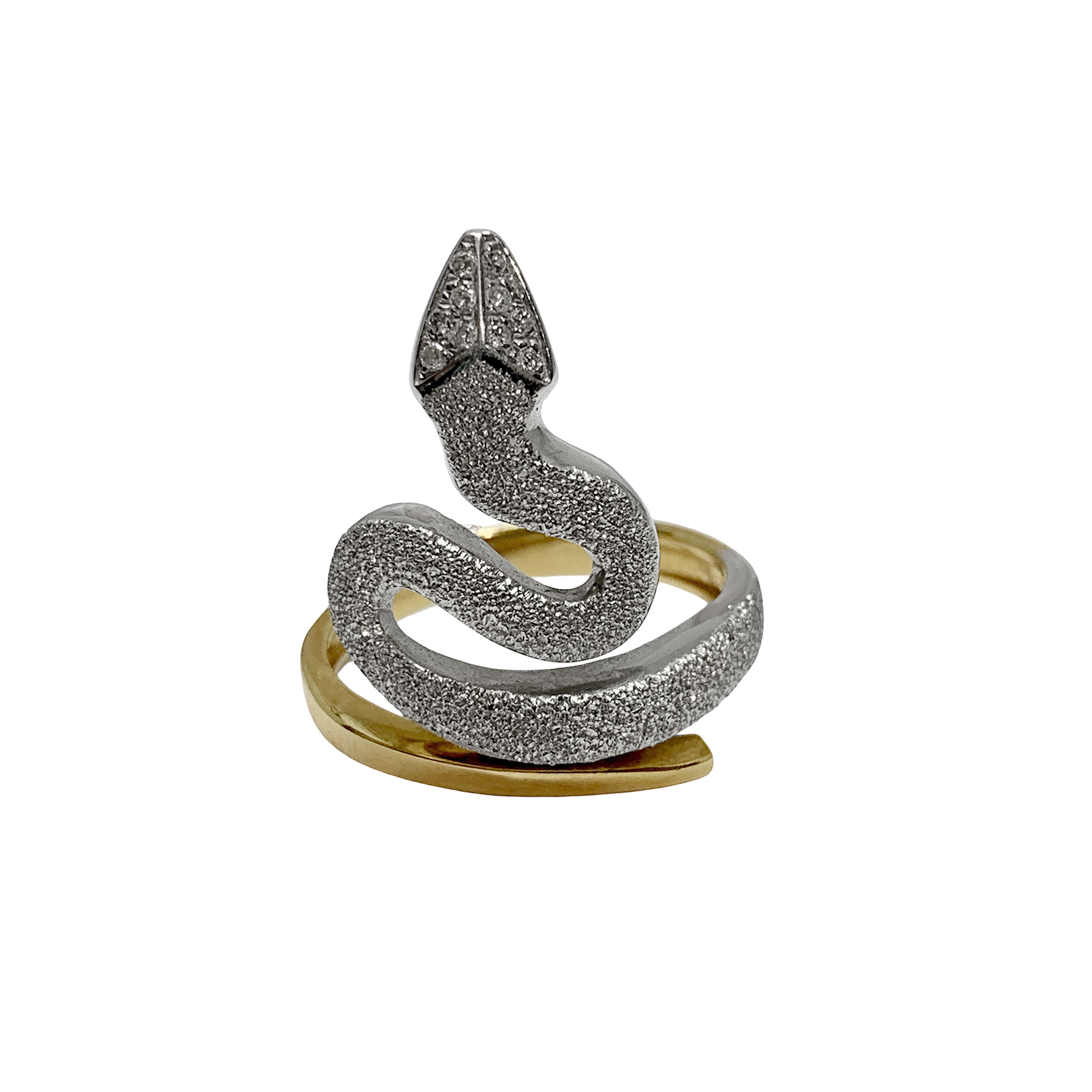 Vintage 18k yellow & white gold snake ring with 10 white diamonds made in Italy.