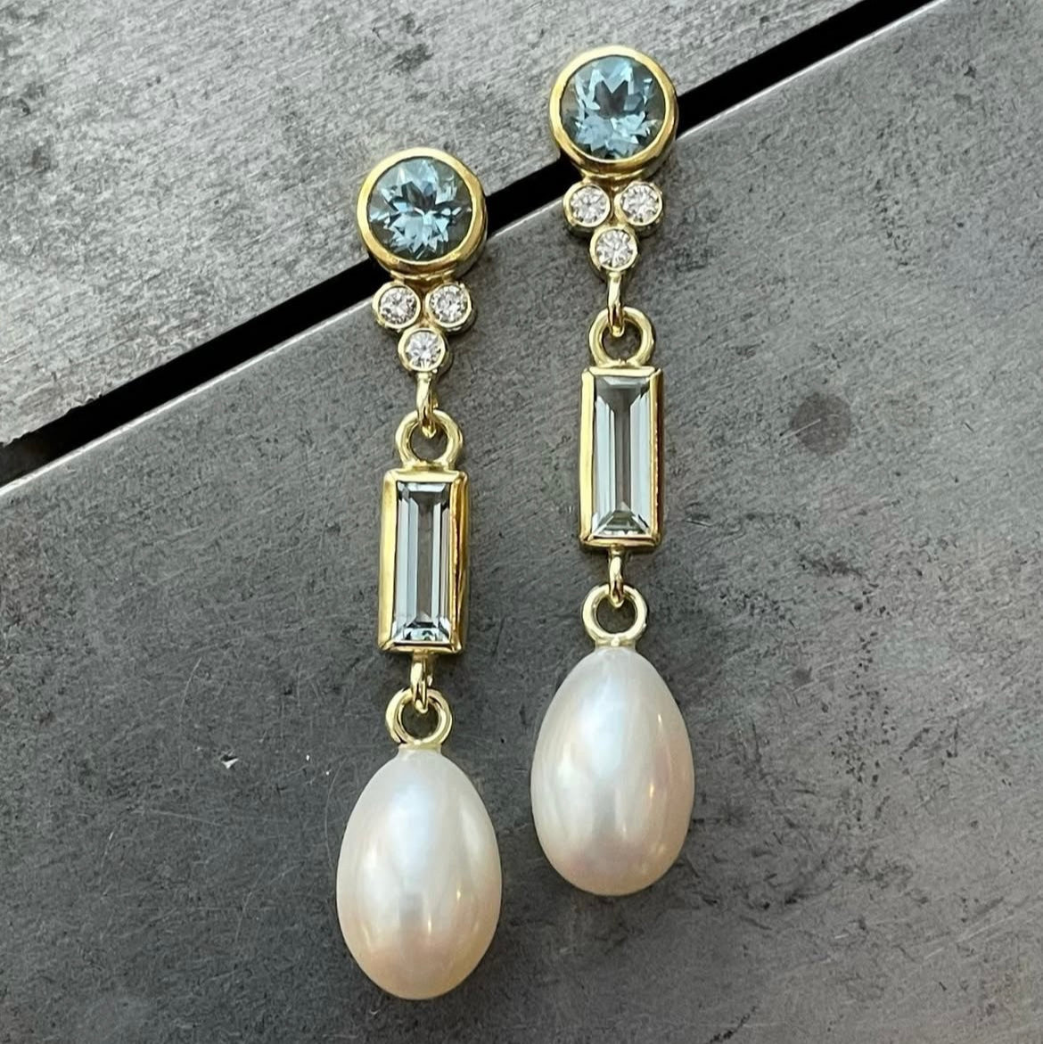 18k yellow gold earrings with 22k bezels set with Aquamarine and Diamonds with Pearl drops.