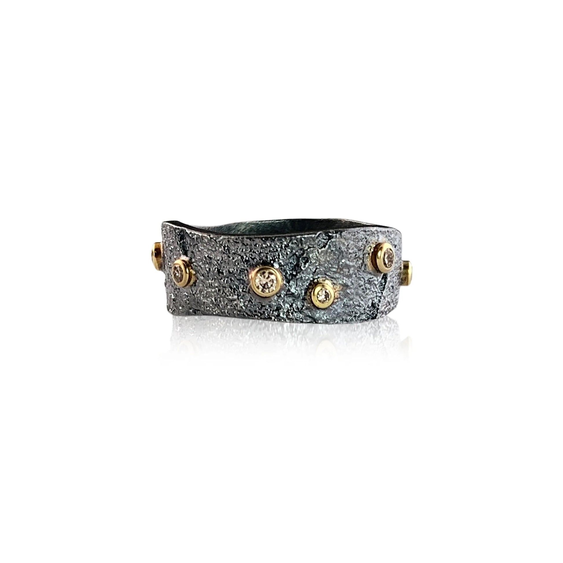 This textured, oxidized silver band has undulating edges and is highlighted with sparkling champagne diamonds in 18K gold bezels for the perfect mix of earthy and edgy. At 8mm wide it’s substantial on it’s own but also narrow enough to stack with another ring - or two!
