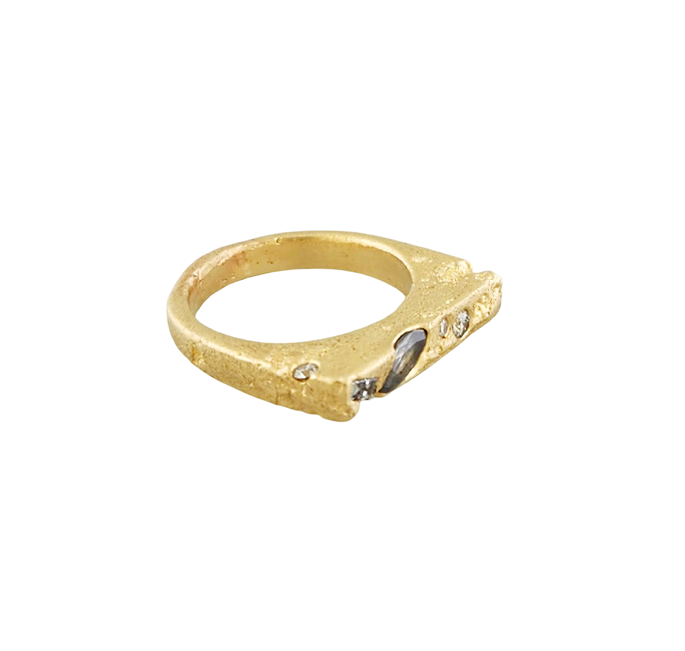 14k yellow gold sand cast ring with a stunning array of 7 white and gray diamonds, in round, marquise and baguette cuts. This is an original, hand crafted, One-of-a-Kind piece by Cristello & Co.