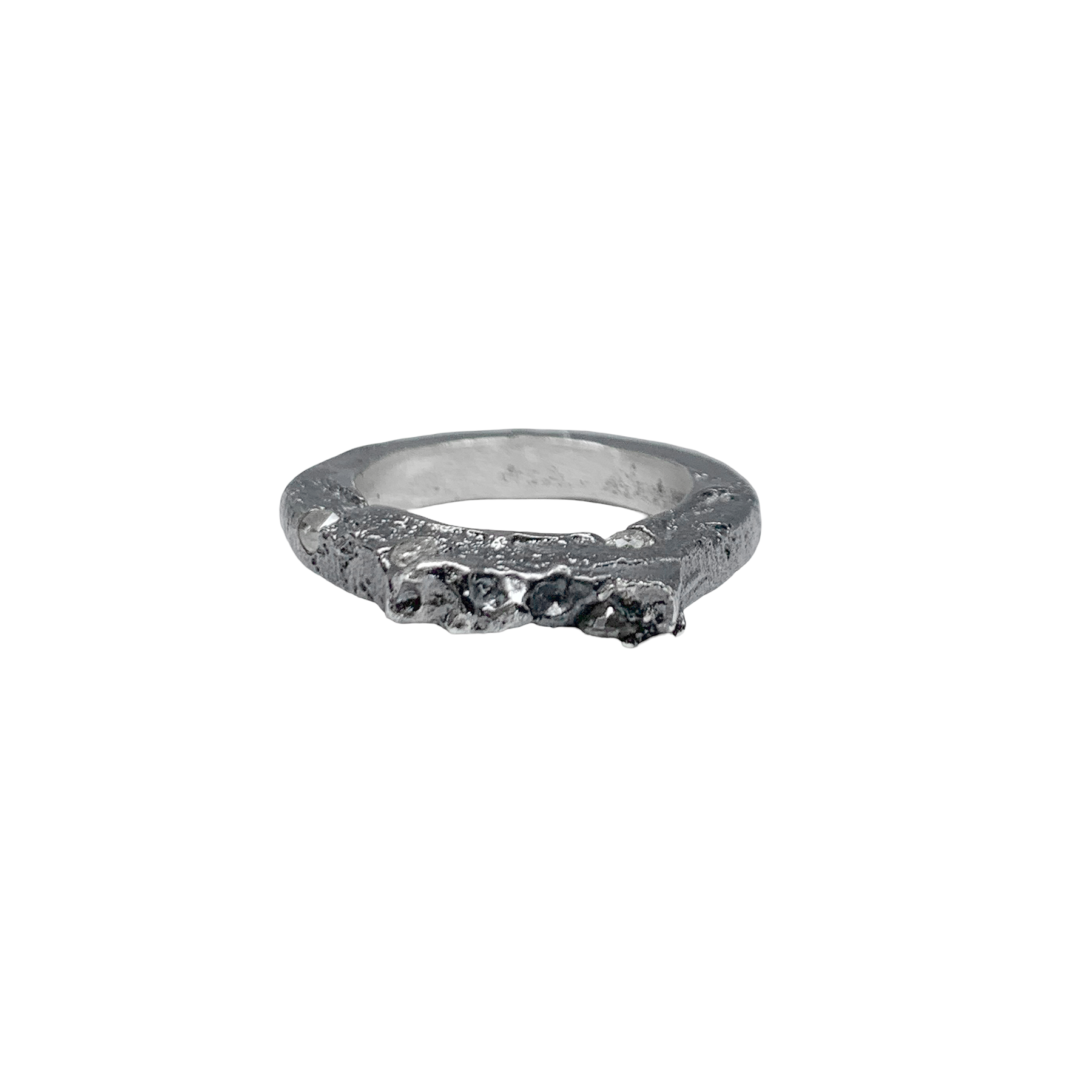 One-of-a-kind sand cast sterling silver ring with 4 scattered round white diamonds. This is an original, one-off sand cast piece.