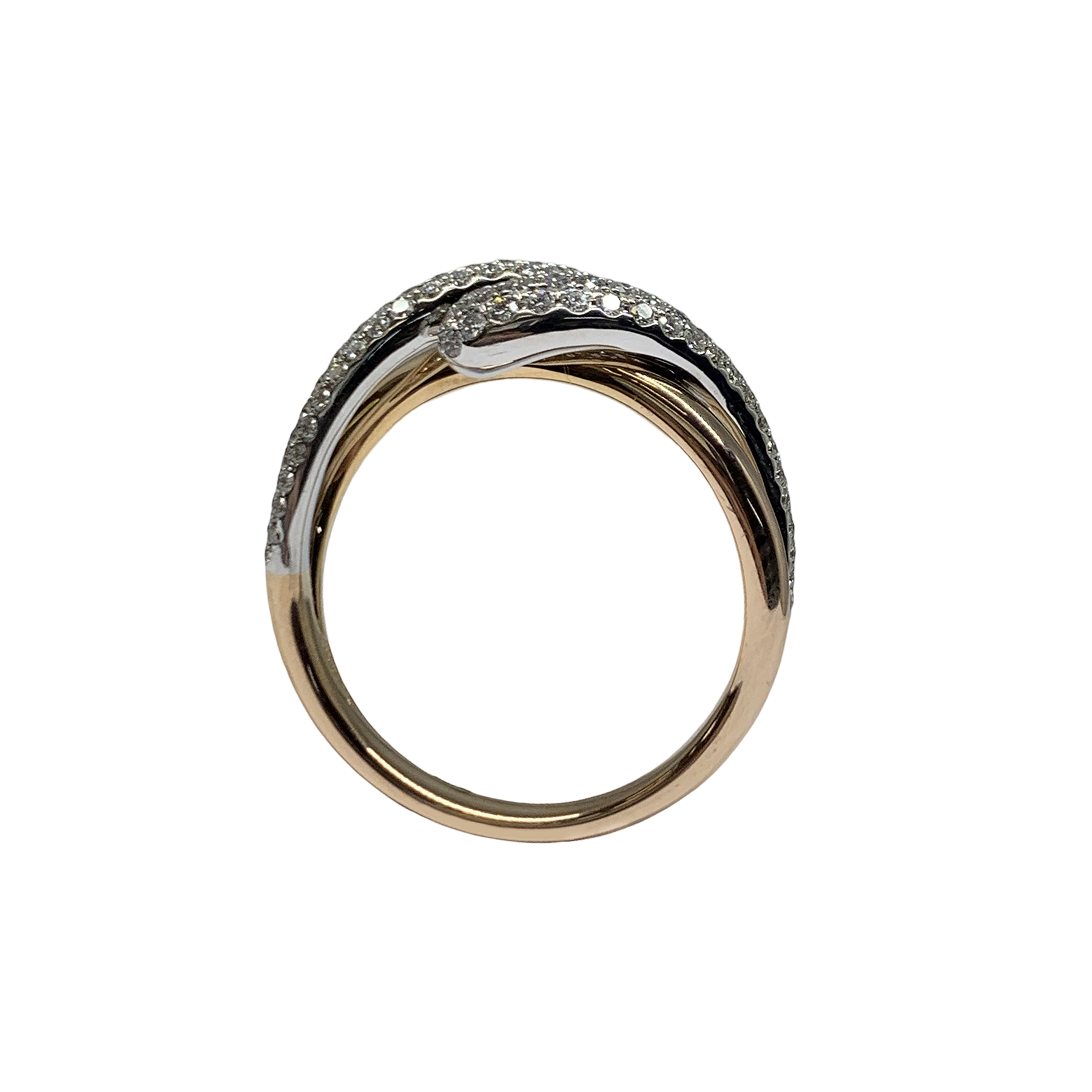 18k rose and white gold cross over band. Set with 0.51 carats pave white diamonds.