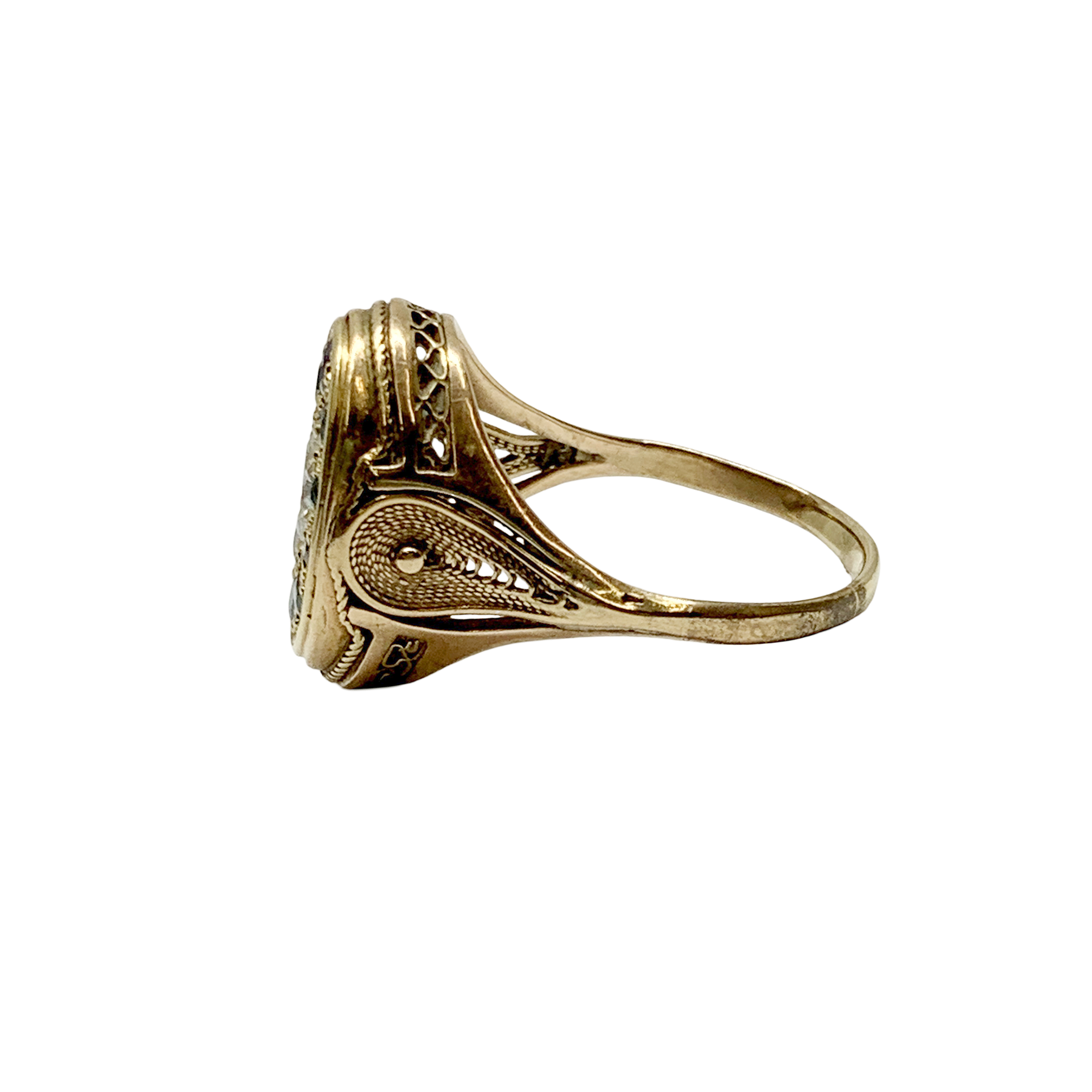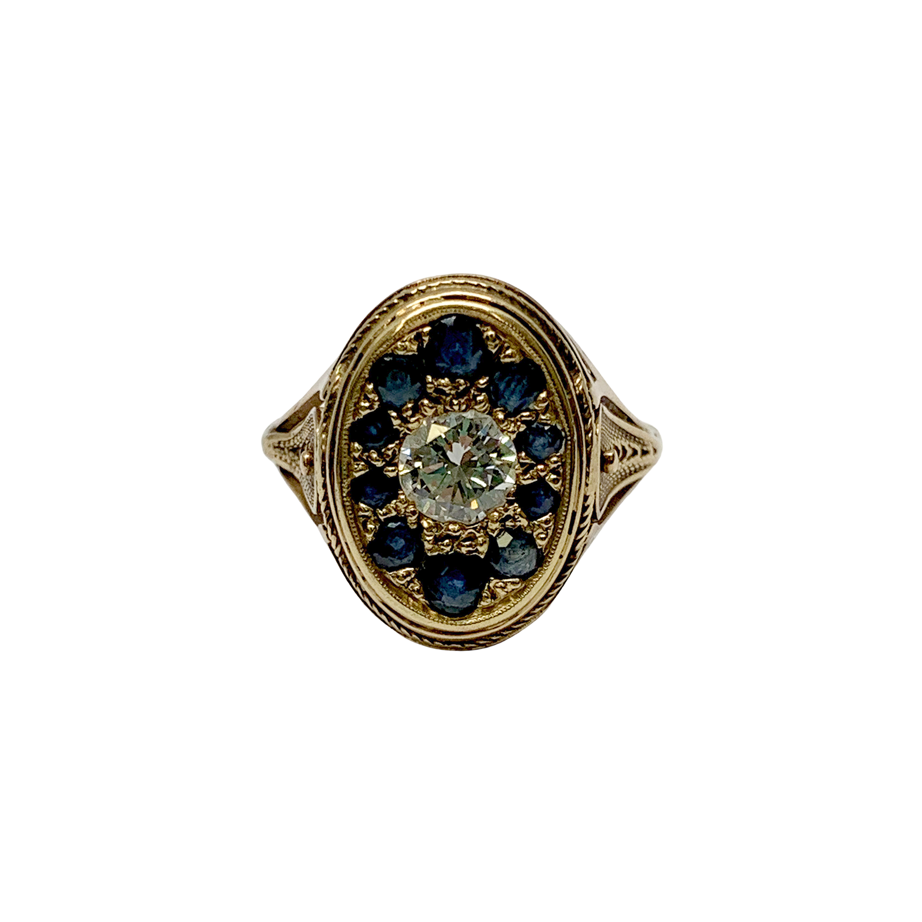 14k yellow gold filigree detailed ring with a brilliant cut white diamond surrounded by 10 faceted blue sapphires.