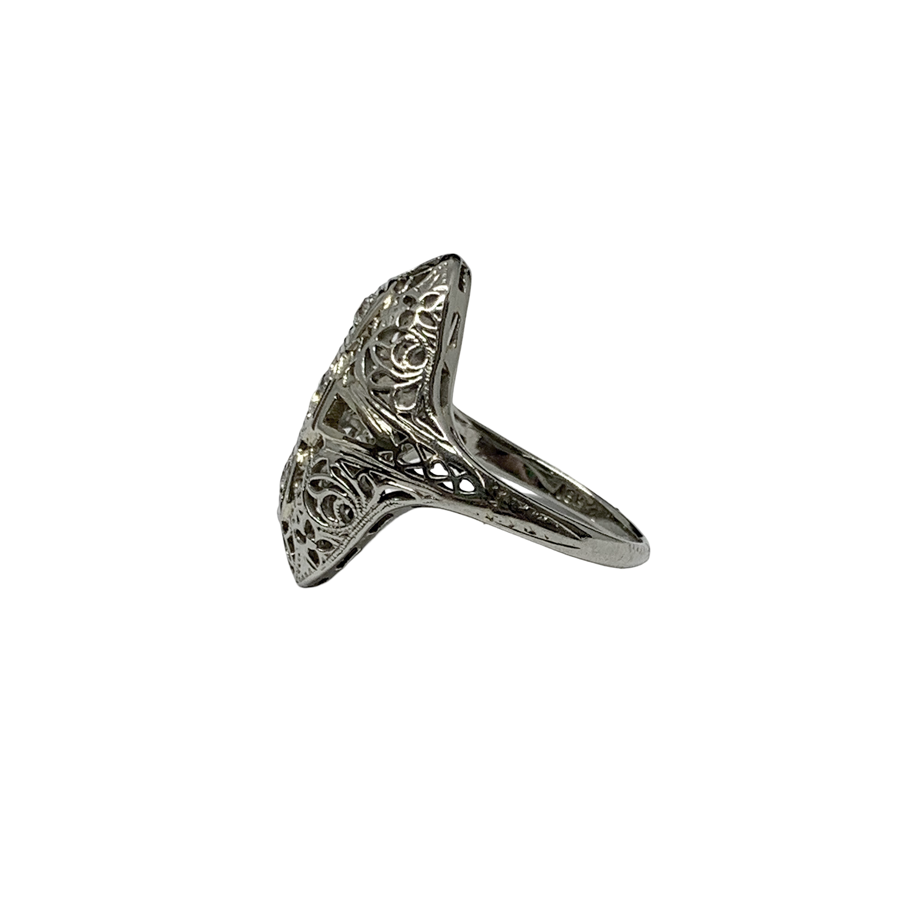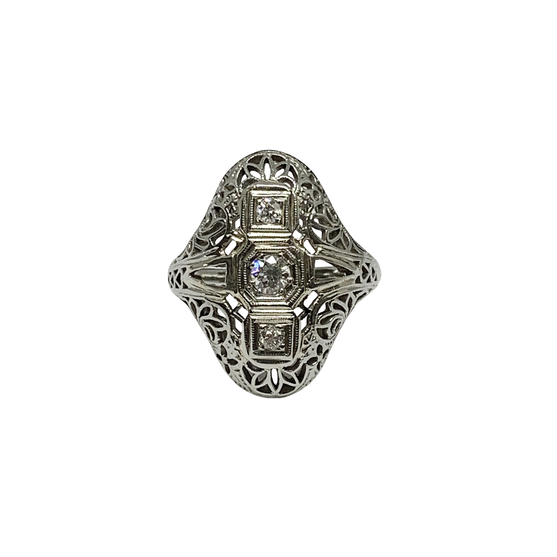 18k white gold Art Deco Filigree detailed ring set with 3 round brilliant cut white diamonds.