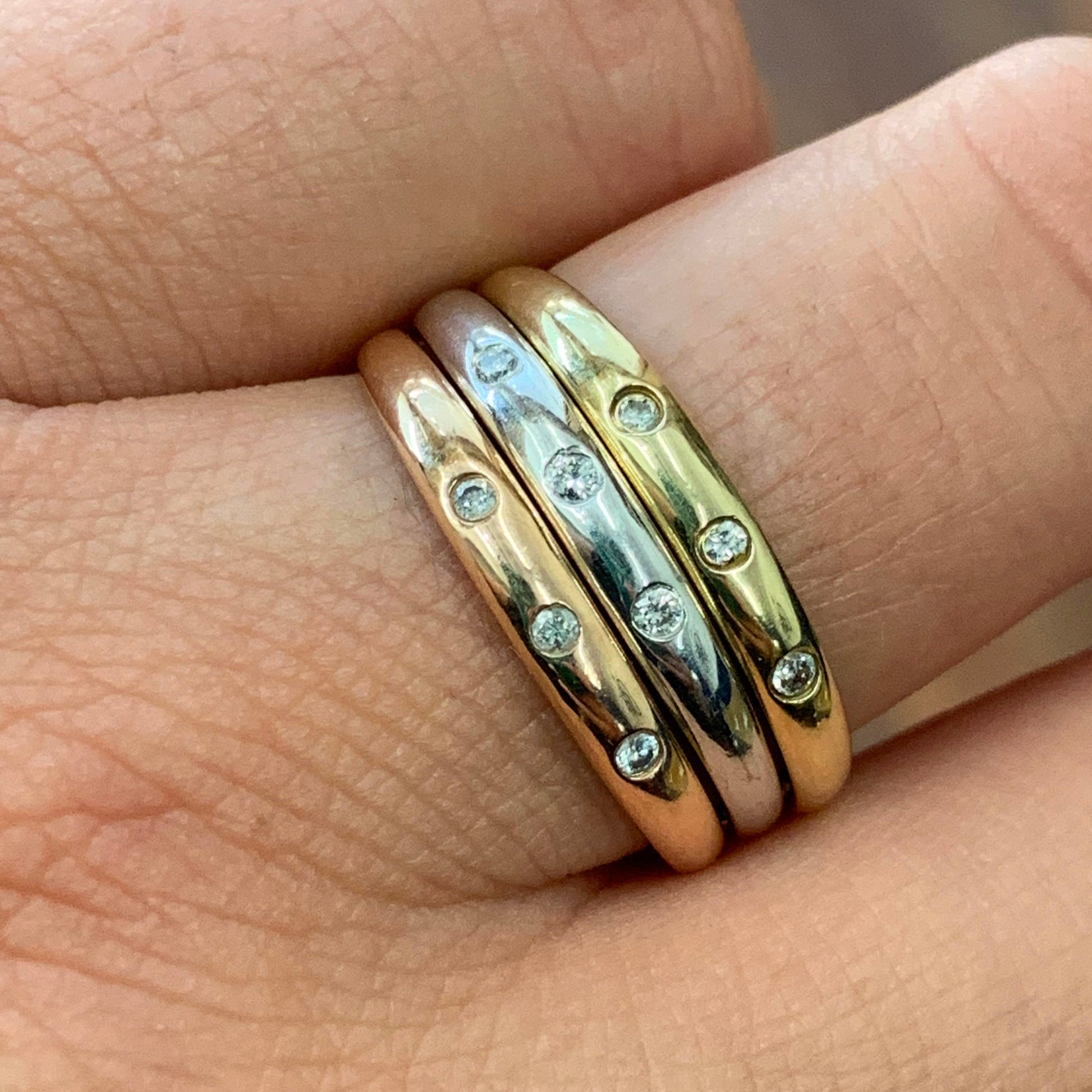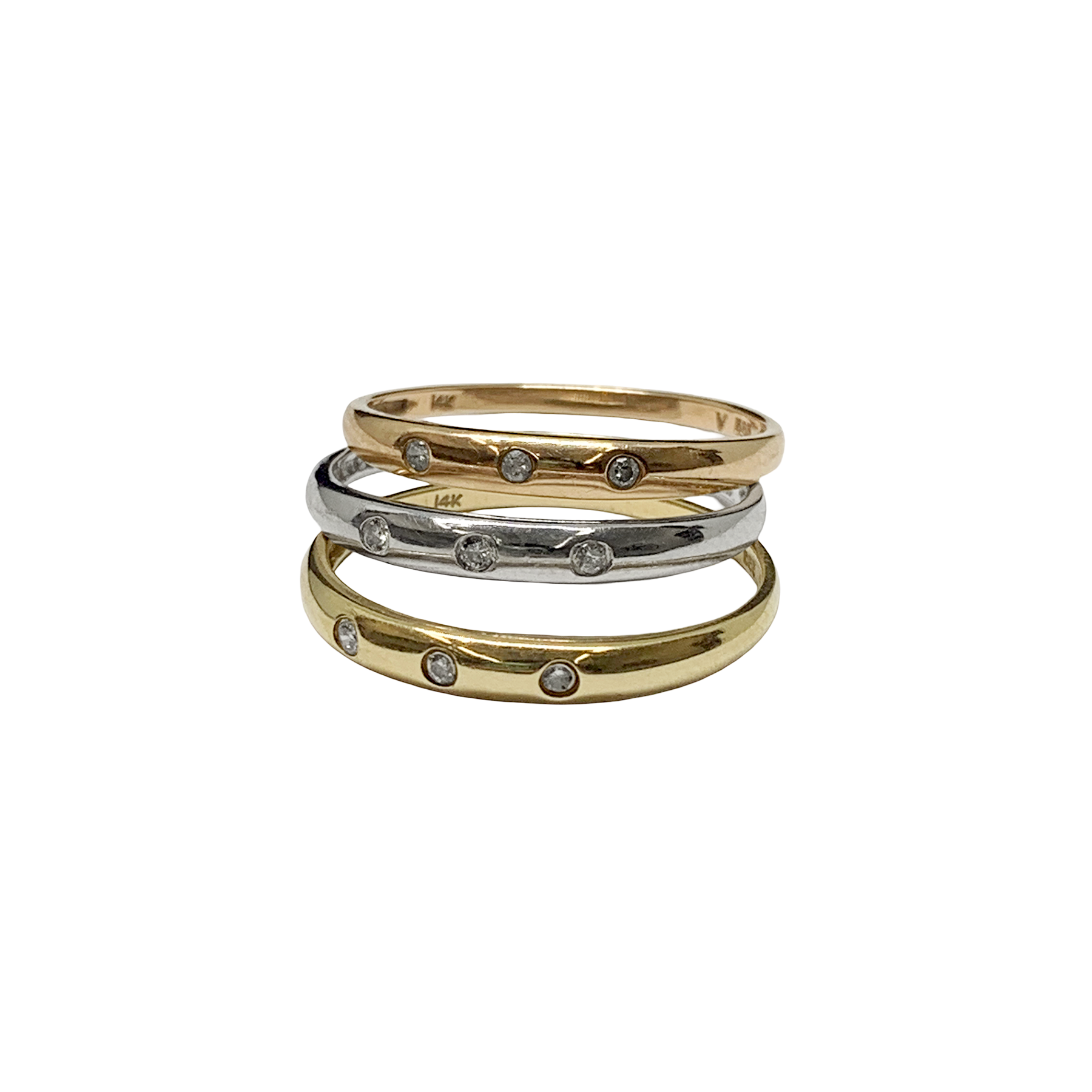 Three ring stacking band set. 14k yellow, rose and white gold, each set with 3 white diamonds.