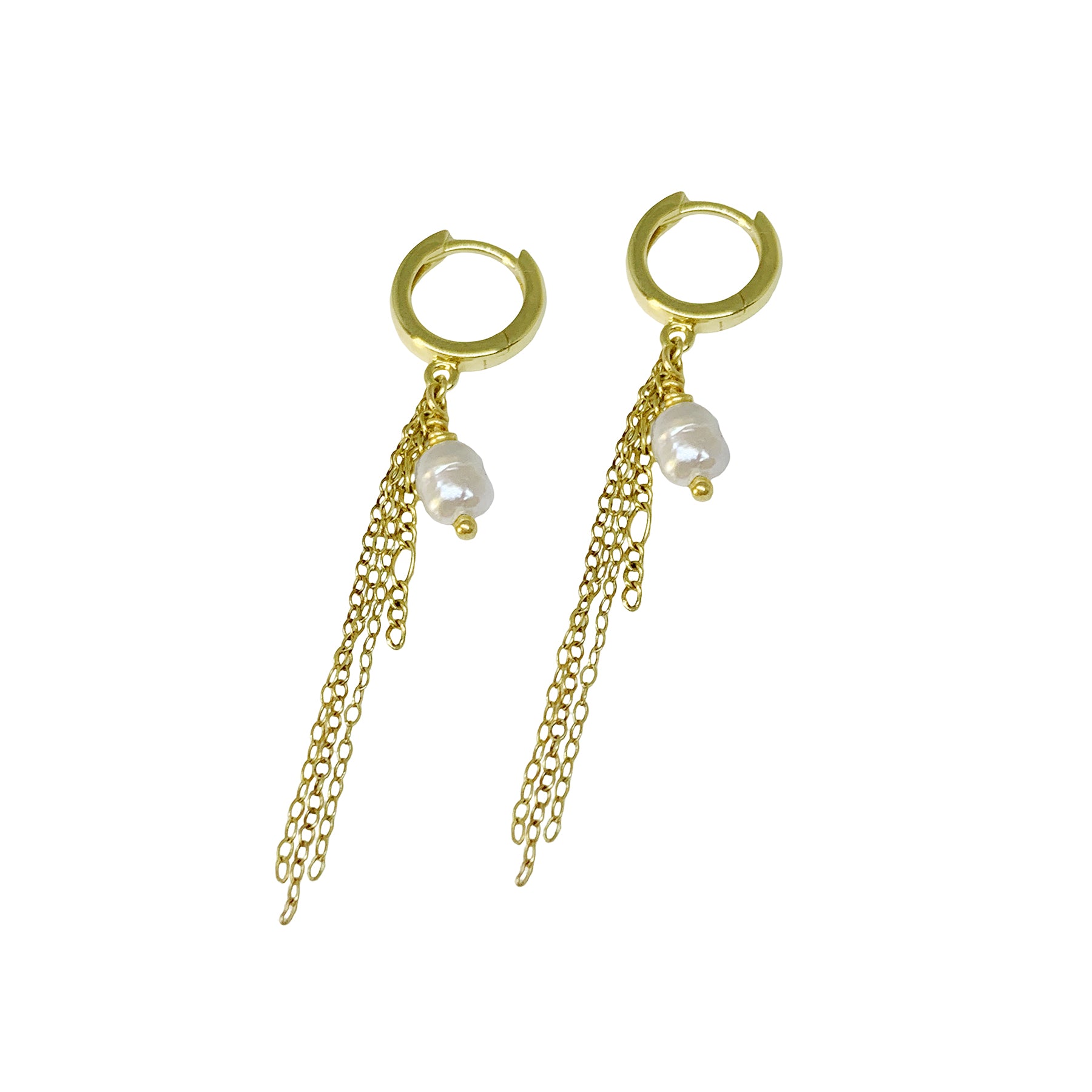 14k yellow gold huggie hoop earrings with chain and pearl dangles.