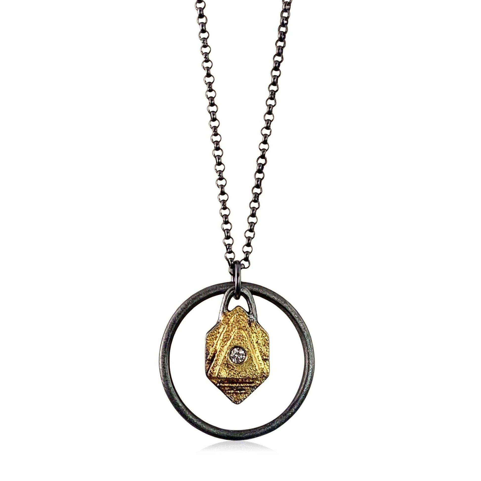 This geometric pendant in oxidized sterling silver and 23K yellow gold sparkles with layers of texture and a flush-set lab grown white diamond at the center. A classic shape with modern edge it's perfect for layering or on it’s own.
