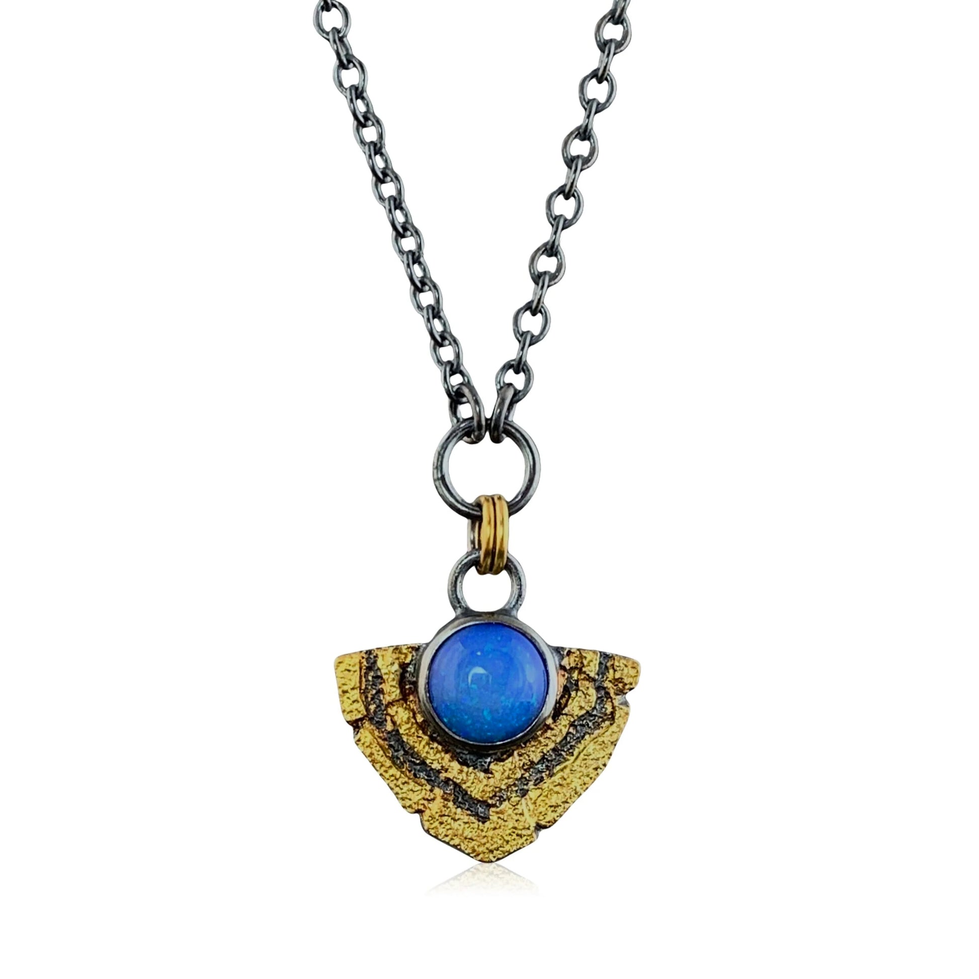 Modern with an ancient vibe, this Ethiopian opal pendant is highlighted by textured tree rings of oxidized silver with 23K gold for sparkle and an oxidized silver bezel for extra edge. Each stone is hand selected and oriented for maximum flash and optical effect.