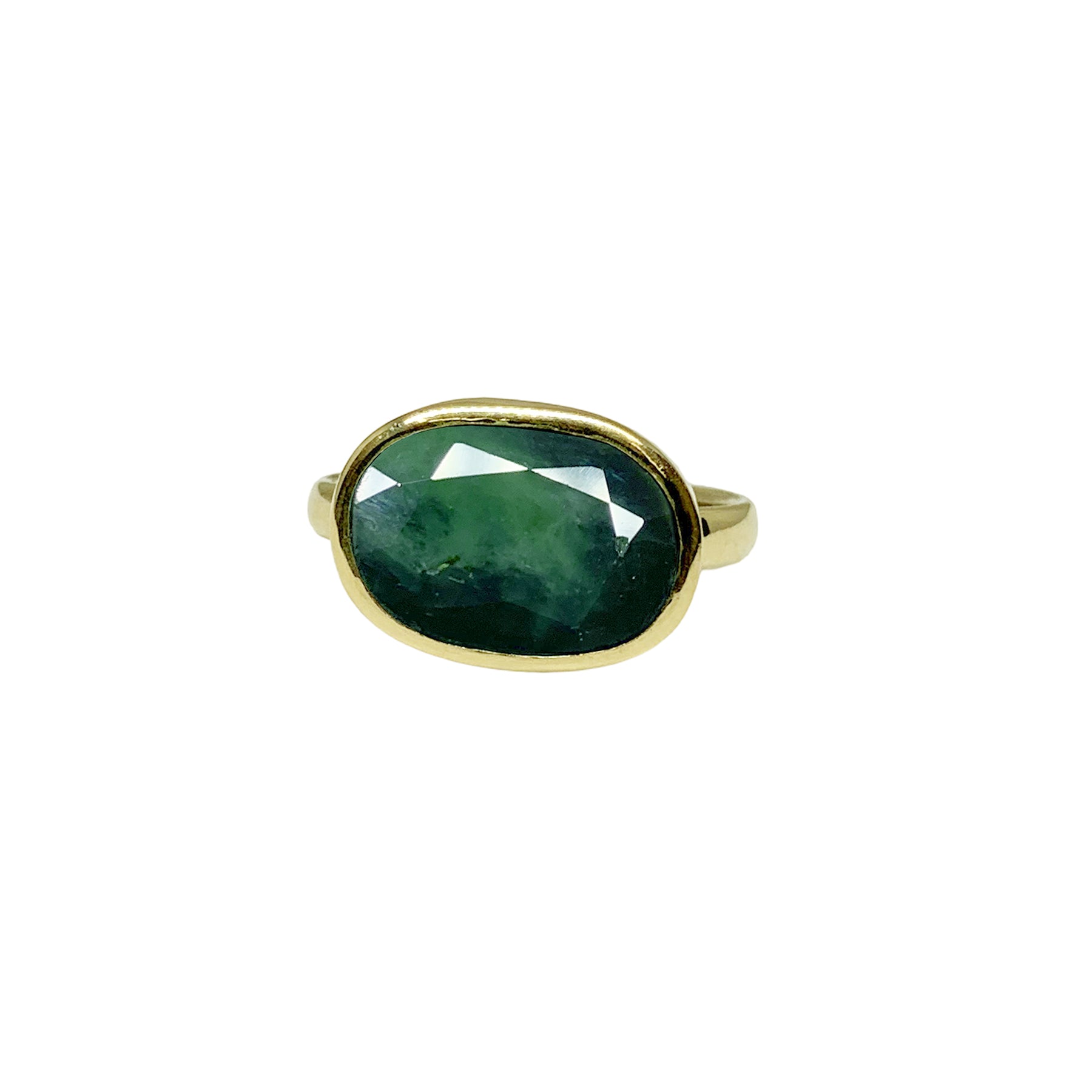 14k yellow gold ring bezel set with an oval faceted dark blue-green sapphire.