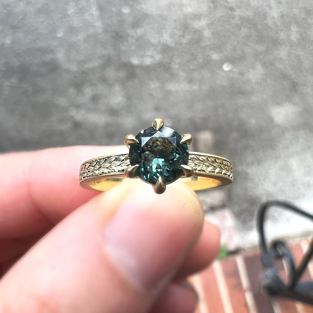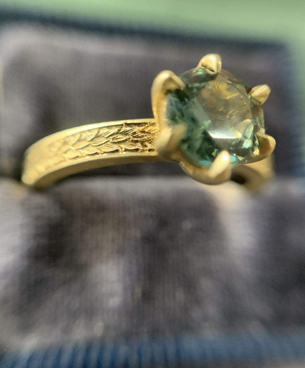 Hand engraved 18k yellow gold and .80 carat Montana mined sapphire Petal Ring by Lauren Ramirez
