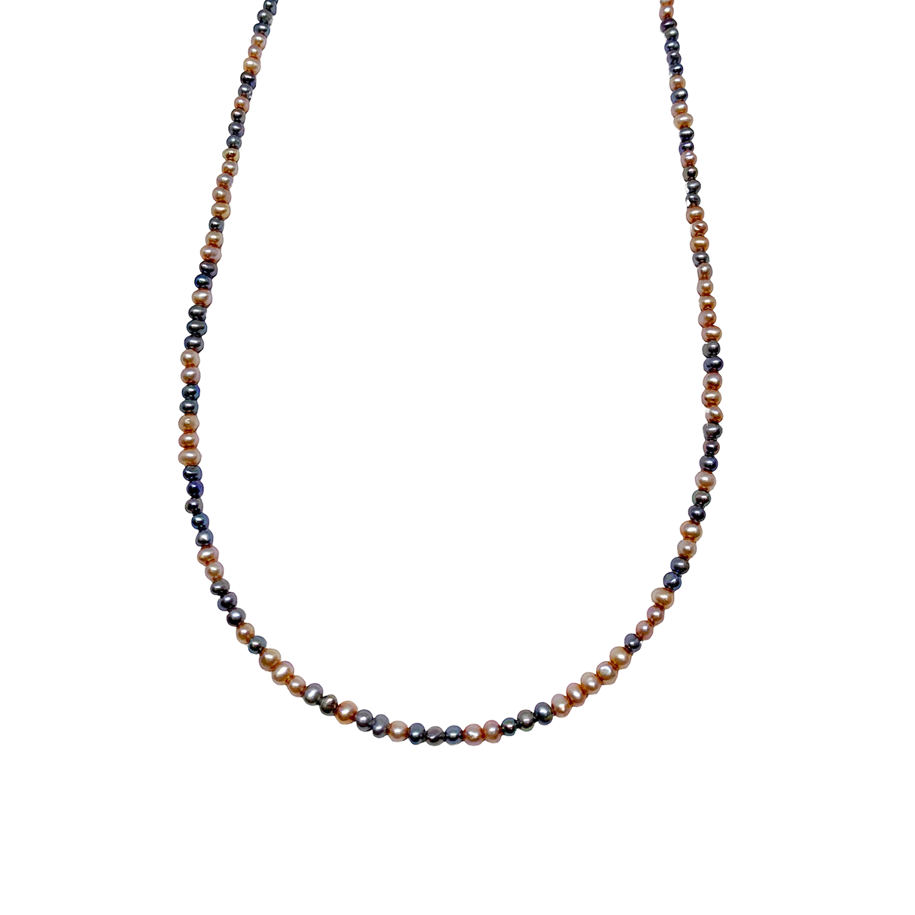 Pearl necklace featuring pink and Tahitian pearls bead necklace hand strung with sterling silver clasp, 20" long by Legion Designs.