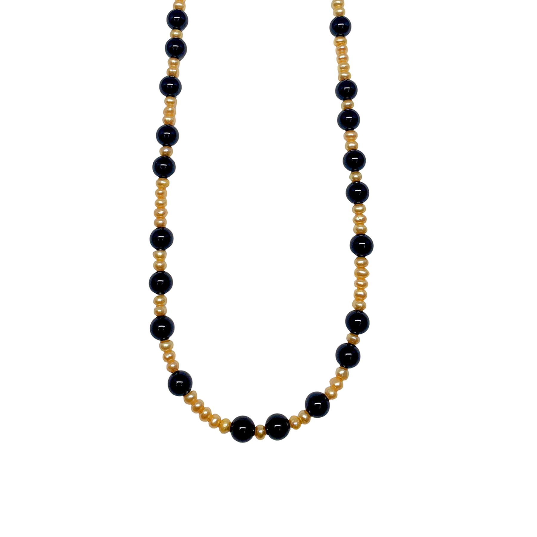 Yellow Pearls with Black Onyx Beads necklace hand strung with sterling silver clasp, 20" long by Legion Designs.