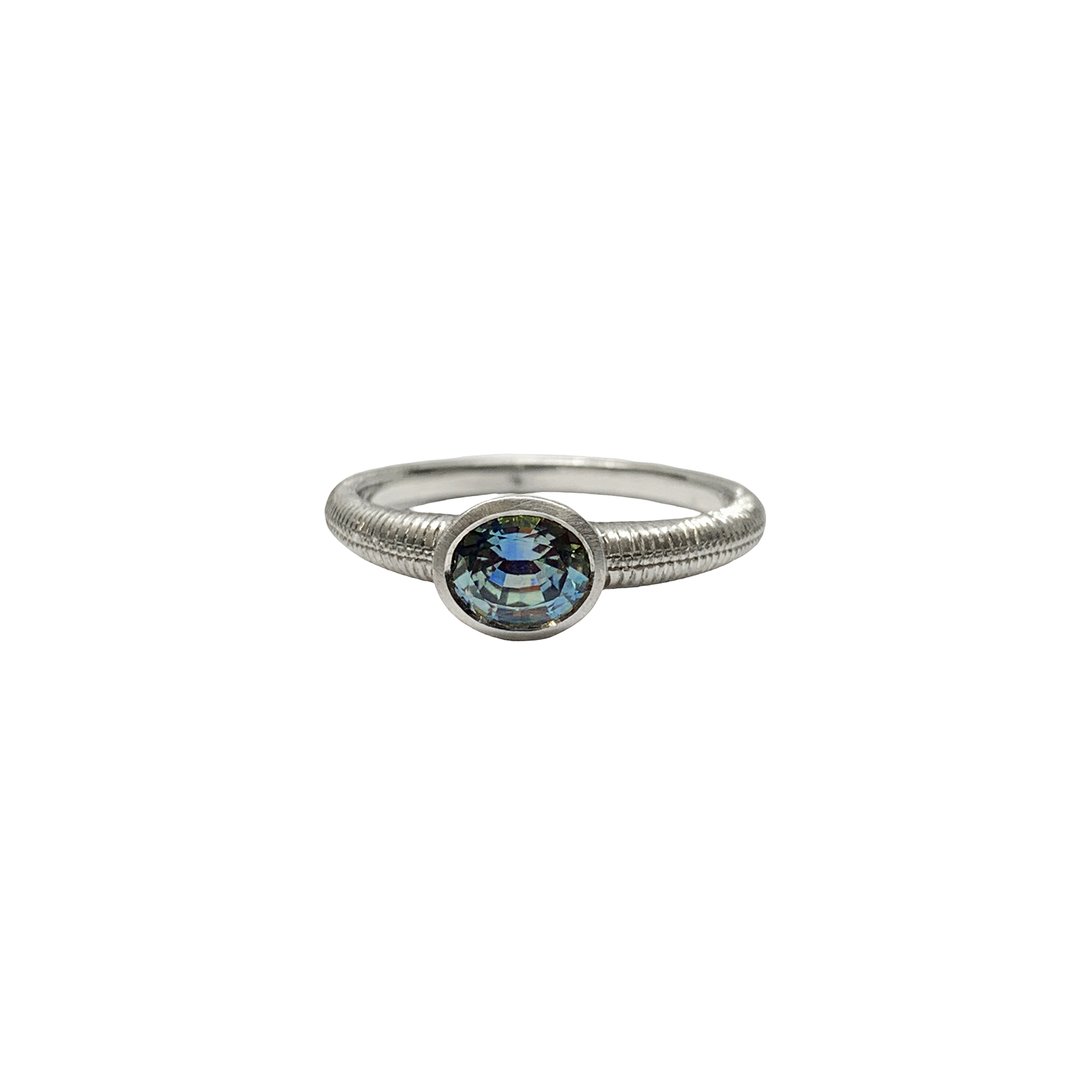 Platinum hand engraved ring with bezel set Montana sapphire by Lauren Ramirez.