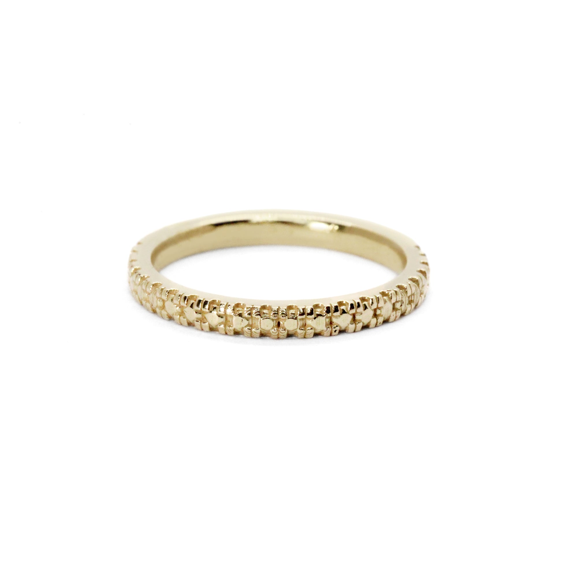 Enjoy an all-metal, whimsical take on a pave' diamond eternity band. Solid gold "diamonds" line this half eternity band, creating a unique and lustrous look.