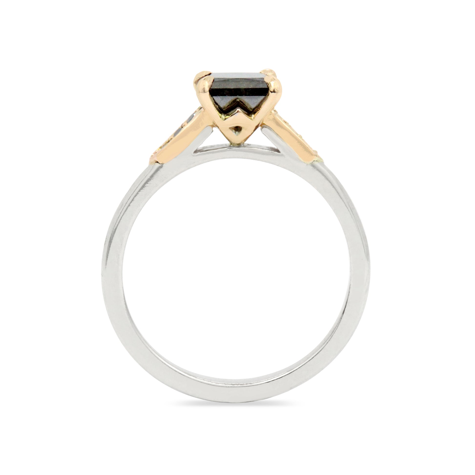 Nick's classic Epaulette setting, crafted with an 18k white gold shank and 4-prong bar setting in 18k rose gold. Features a 0.95ct princess cut black diamond and three black diamonds on each side