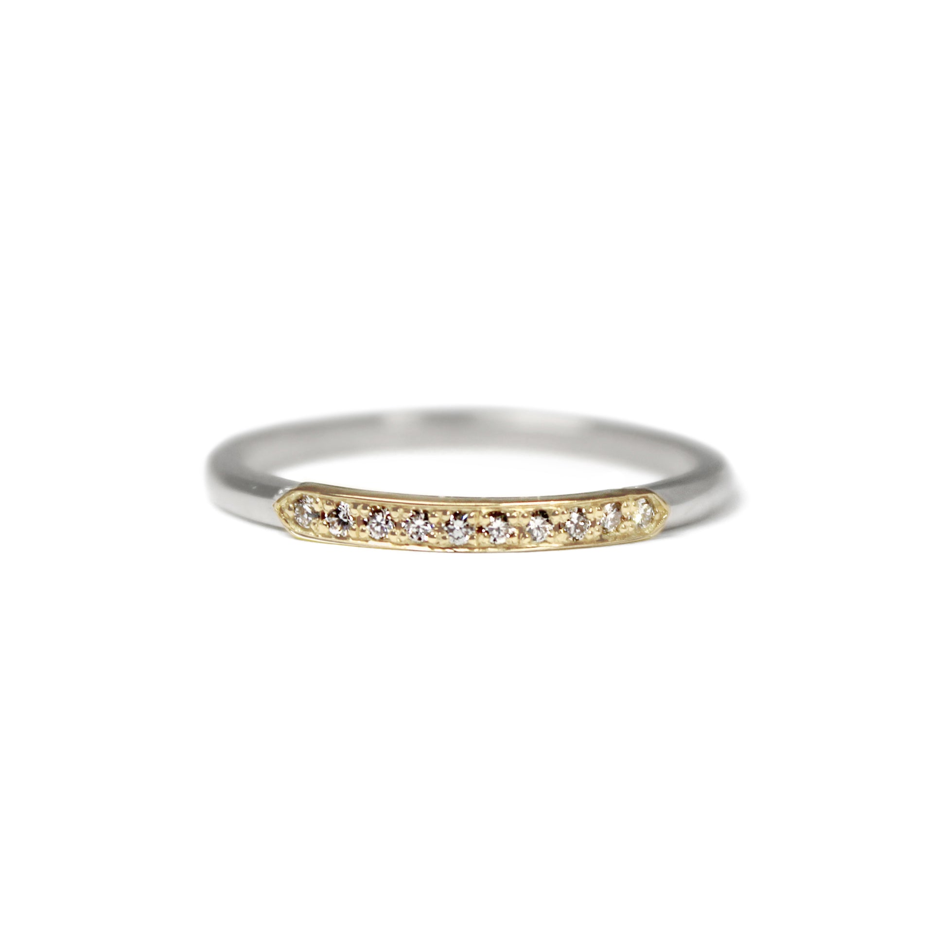 Celebrate the mix of metals with this 18k gold band, featuring a touch of sparkle. A bar of yellow gold, adorned with white diamonds, is set on a white gold band.