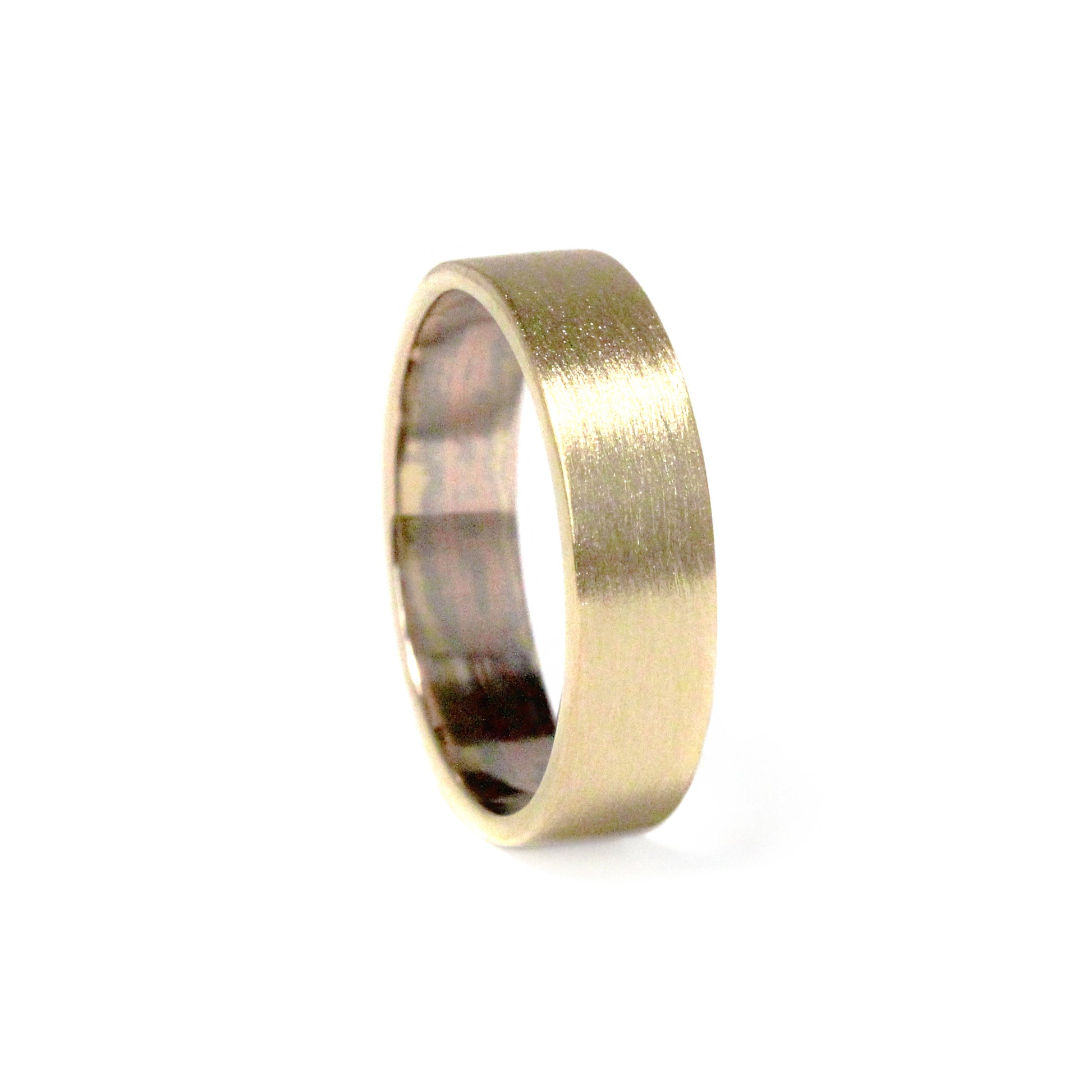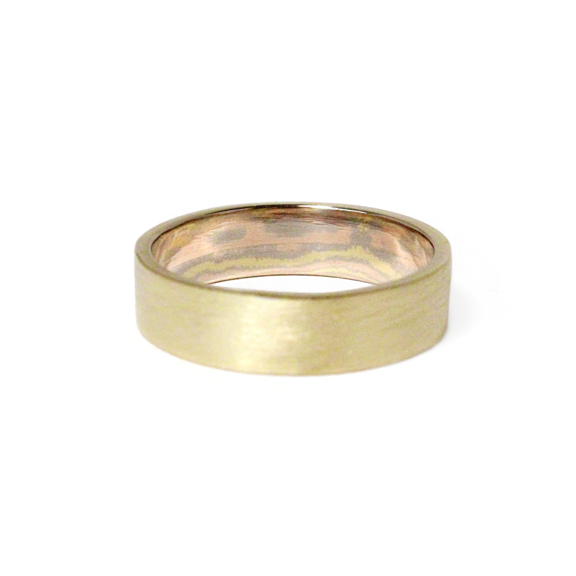Luxe on the outside, party on the inside. Enjoy a Mokume Gane tri-gold pattern inside this distinguished band, while your choice of gold hides your secret on the outside.