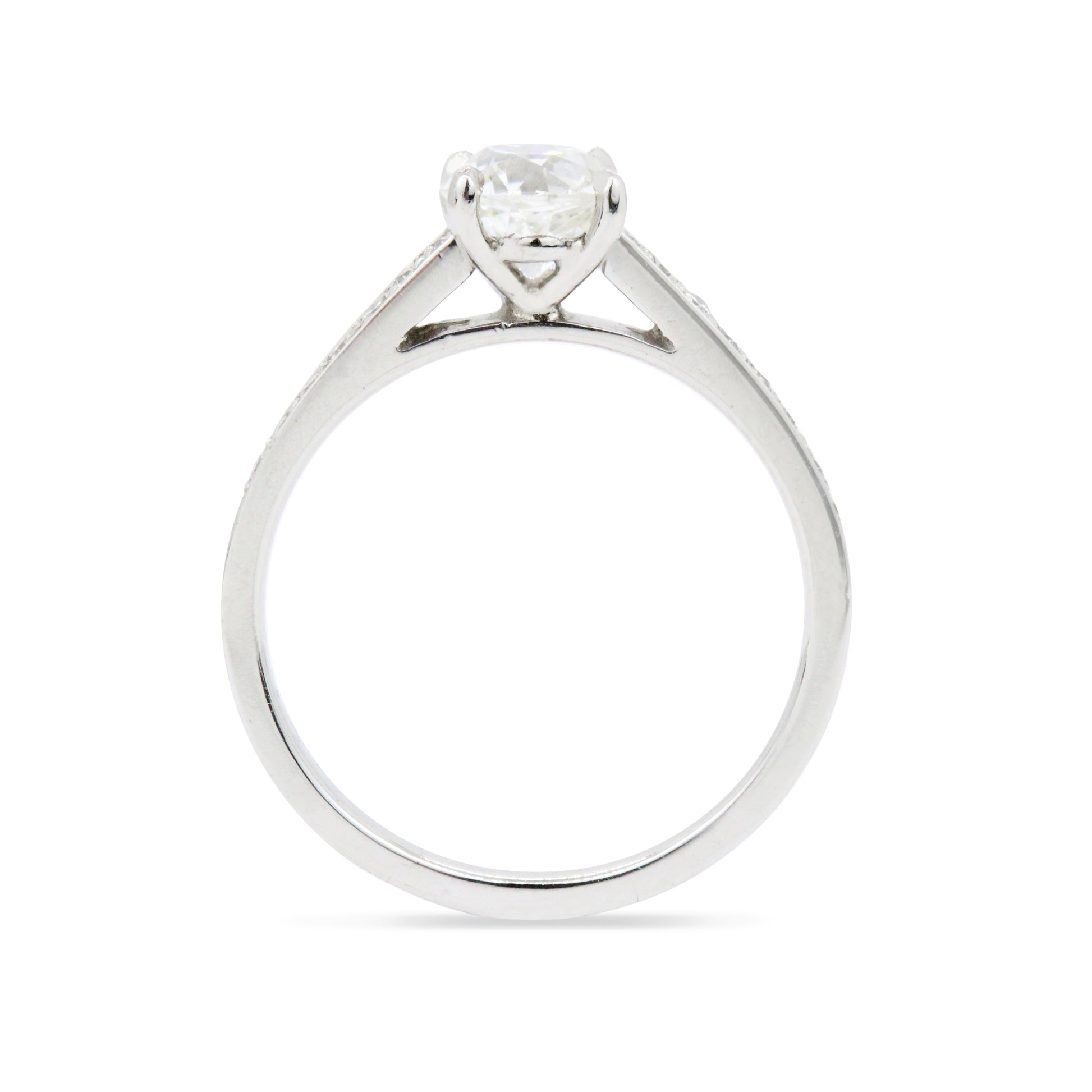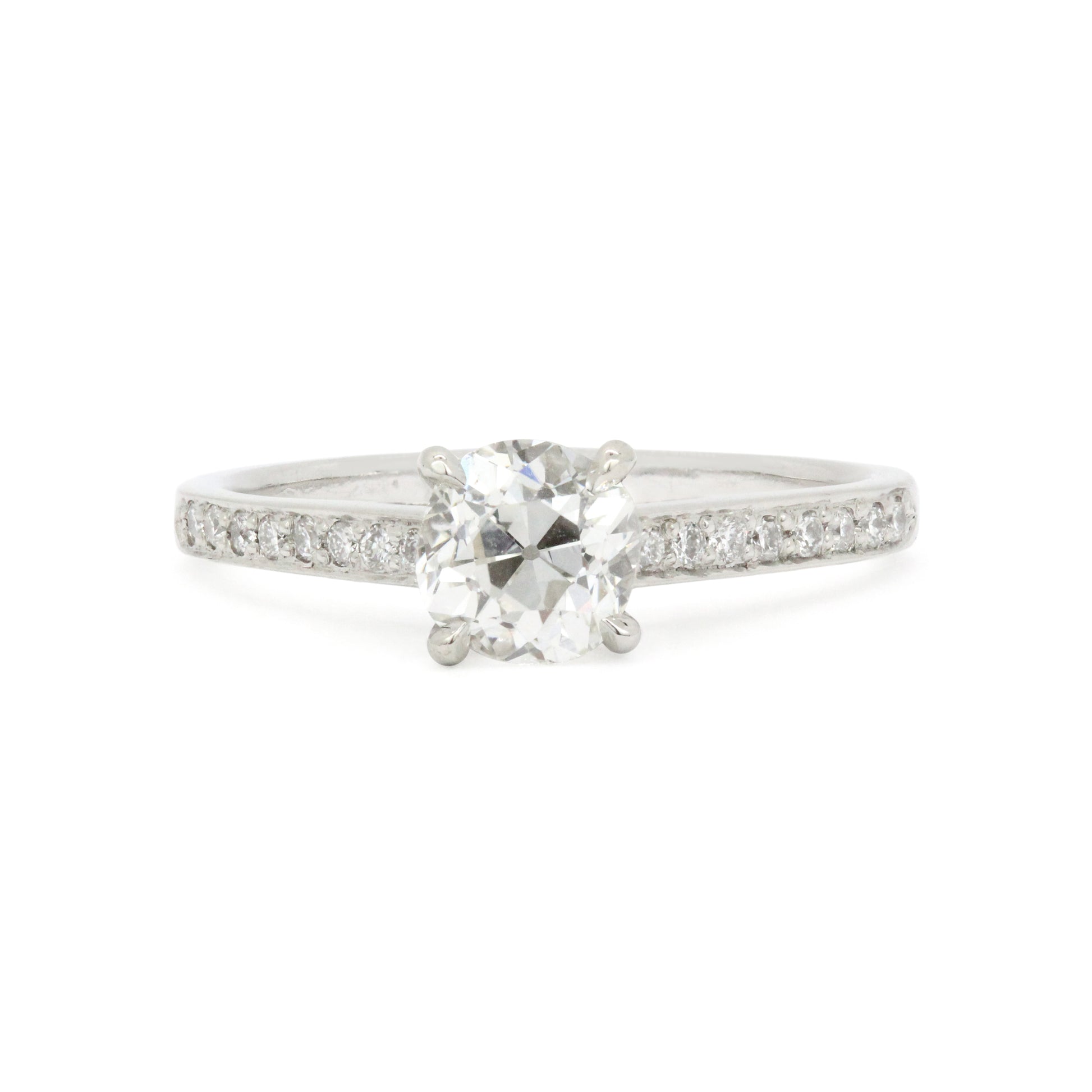 Nick's classic Apex design, crafted in platinum and featuring an old mine cut diamond center and sparkling white diamonds on the shoulders.