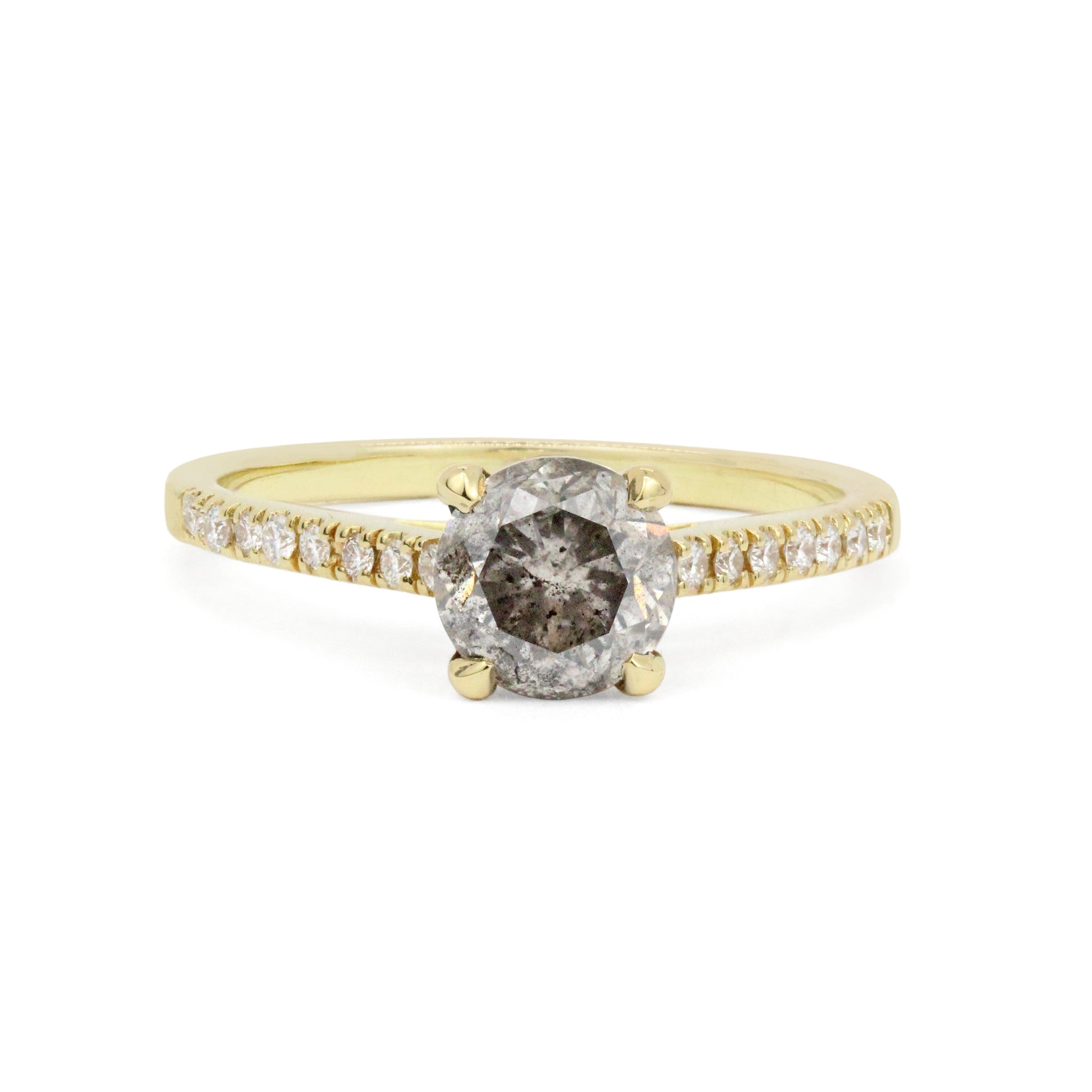 A diamond-lined Apex setting holds a stunning 1.07ct salt and pepper center diamond and F-G VS Canadian origin conflict-free side diamonds.