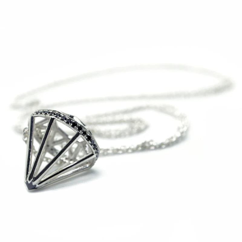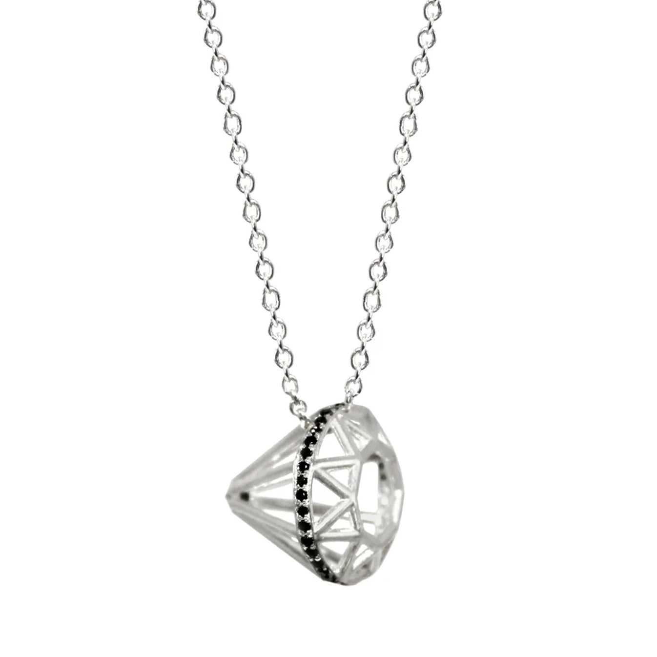 Wear diamonds differently. This striking sterling silver diamond shape hangs on a 30" silver chain. Accented with a black diamond girdle and culet, this geometric stunner is full of contrasting sparkle.