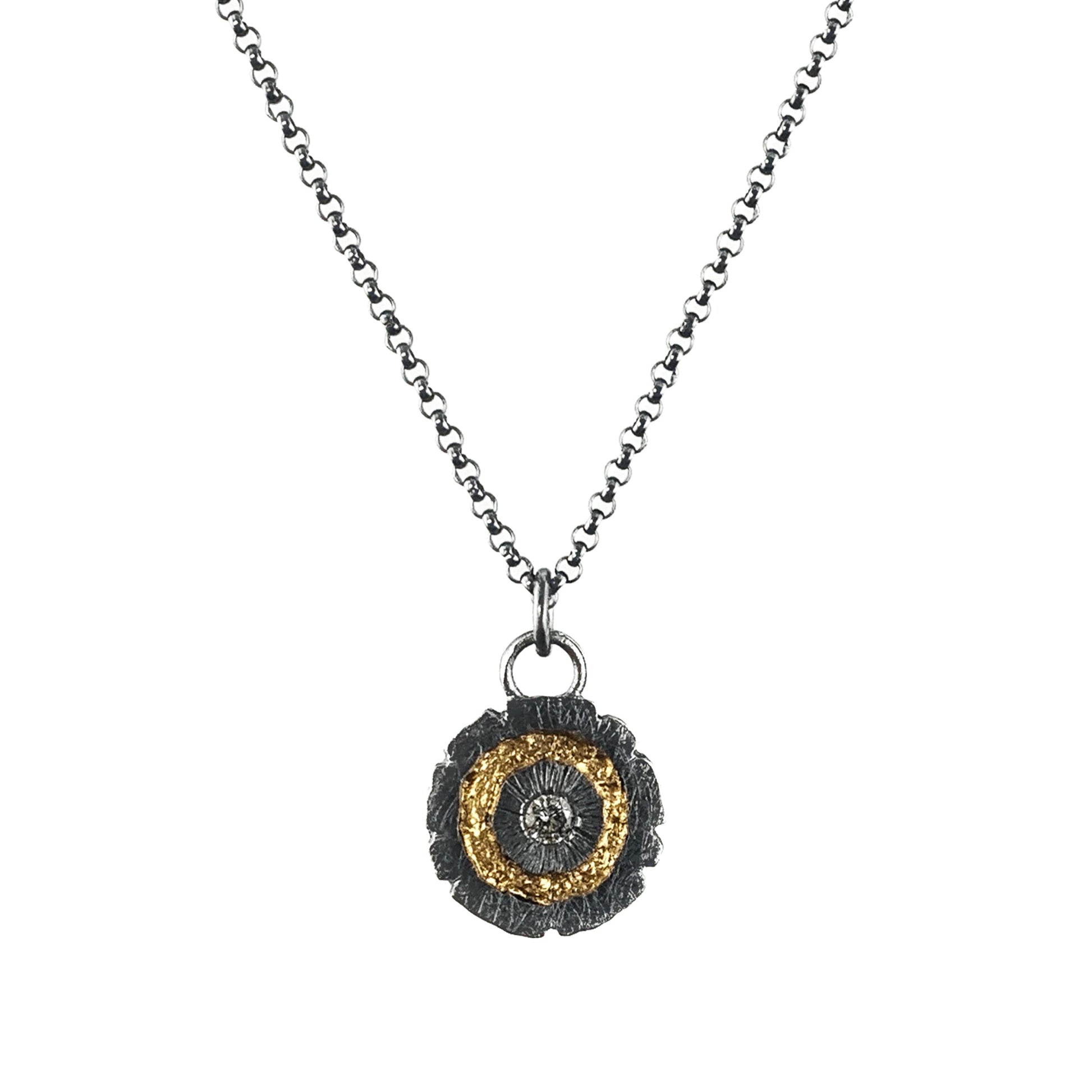 dInspired by the iconic redwoods, this pendant features a flush-set salt + pepper diamond encircled by "tree rings" of textured oxidized silver adorned with 23K gold for a little piece of nature you can wear everyday.