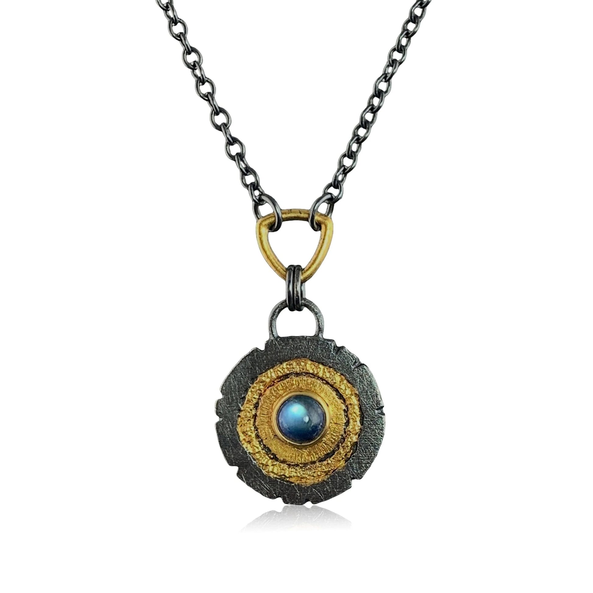 Like a little piece of nature you can wear every day, this chunky pendant features a shimmering rainbow moonstone encircled by "tree rings" of oxidized silver and 23K gold for a mix of city style with organic sensibility.