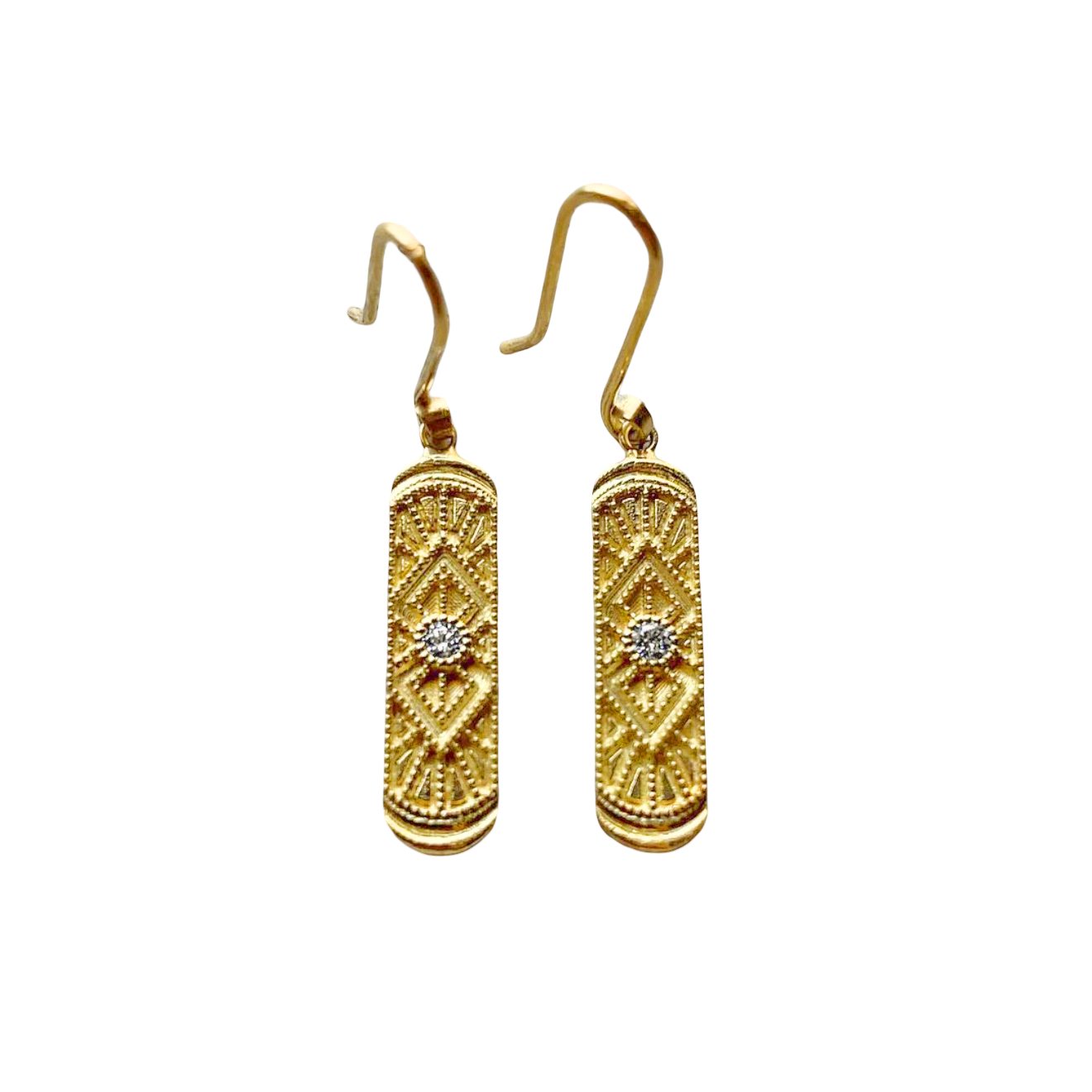 18k yellow gold elongated style with milgrain details dangle earrings set with Canadian mined 2mm round brilliant diamonds, F color, VS1 clarity.