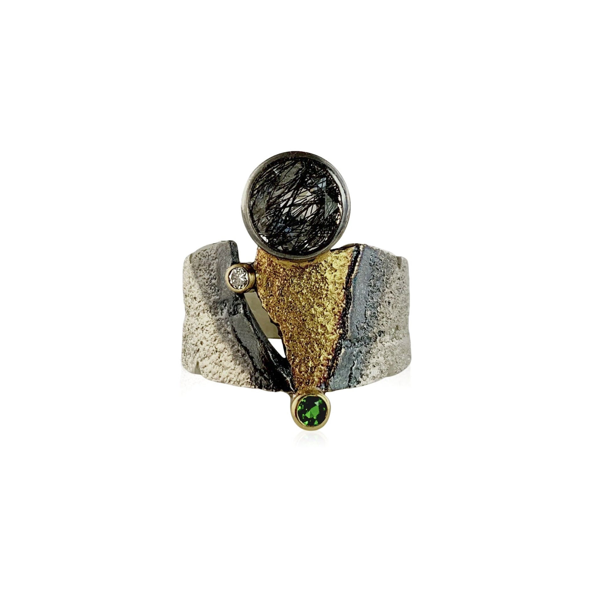Textures, lines and colors come alive in the San Andreas band. A toumalinated quartz tops a textured triangle of yellow gold, while a green garnet completes this artful ring.