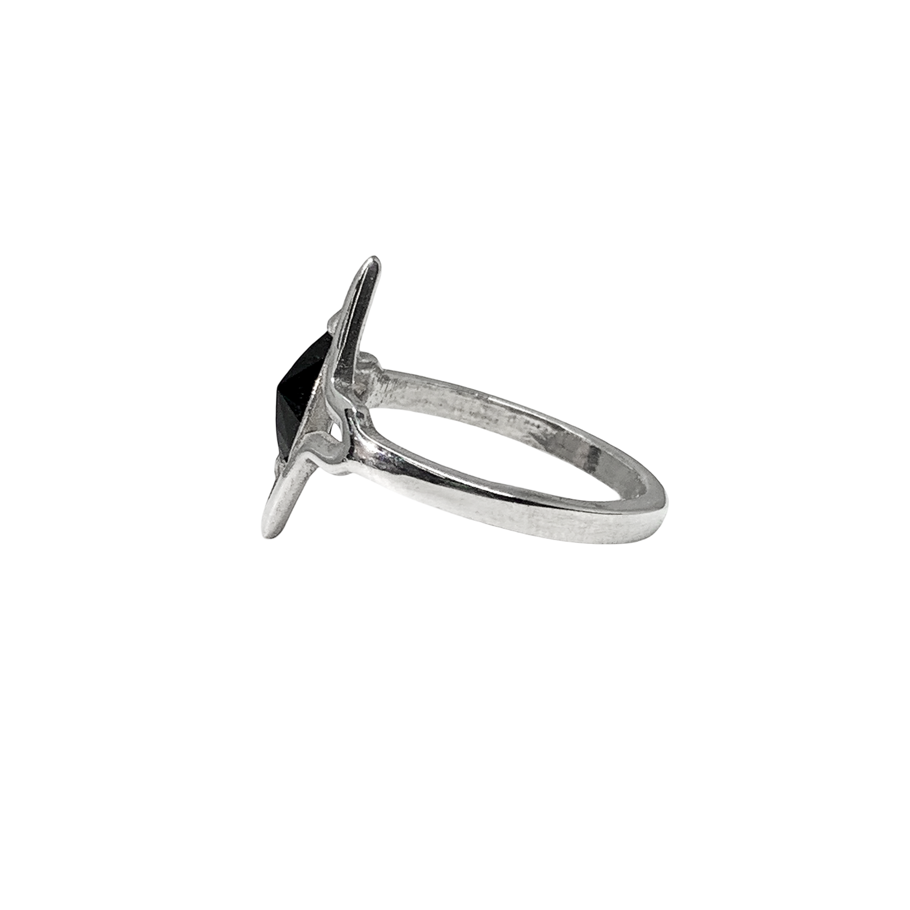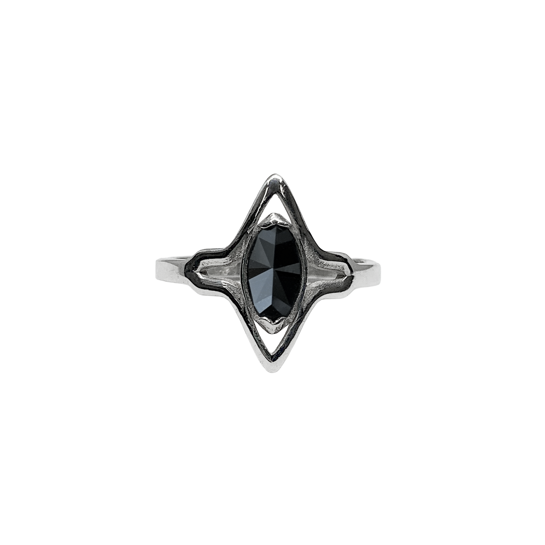 Sterling silver Eye of Seraphim ring set with an inverted marquise cut onyx gemstone.