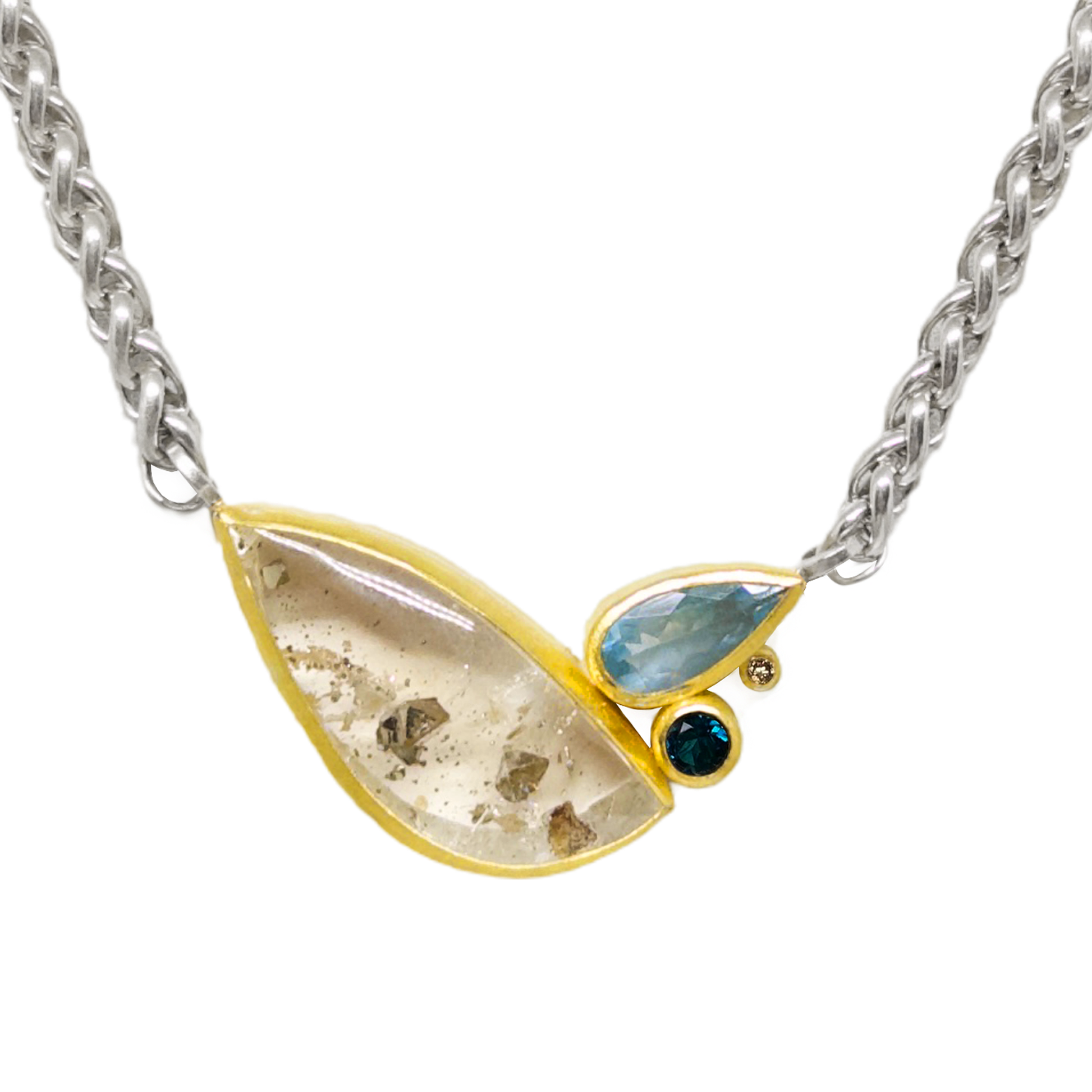 Multi-stone pendant 22k bezel set Pyrite Quartz, Aquamarine, Tourmaline and Diamond necklace on a thick sterling silver cable chain with 18k gold clasp.