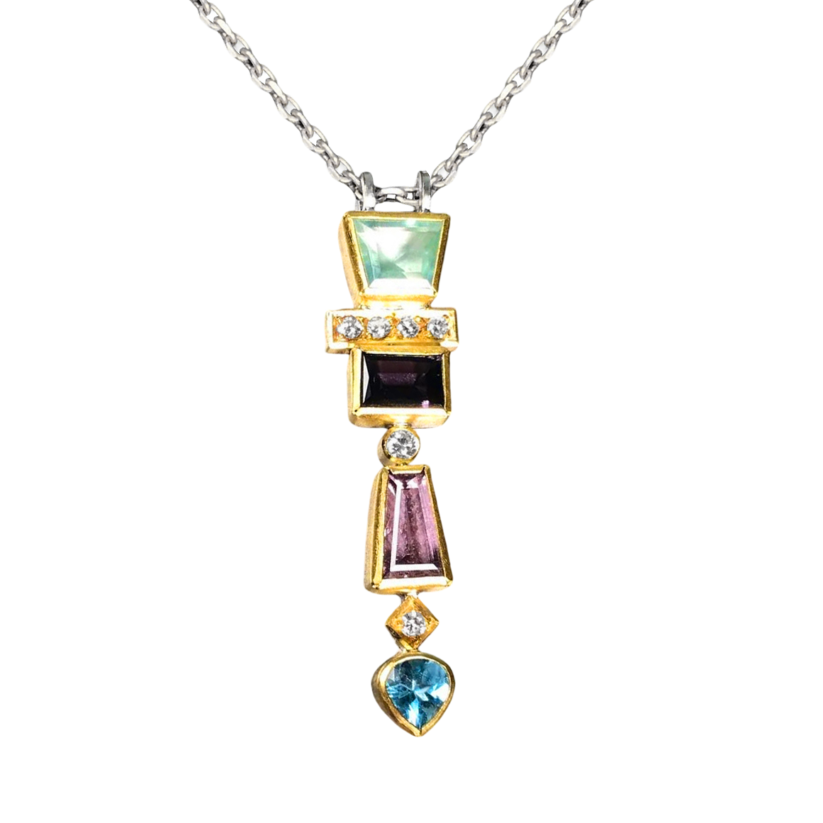22k bezel set 'Totem' pendant with Spinel, Aquamarine and diamond on a 20" adjustable sterling silver chain.