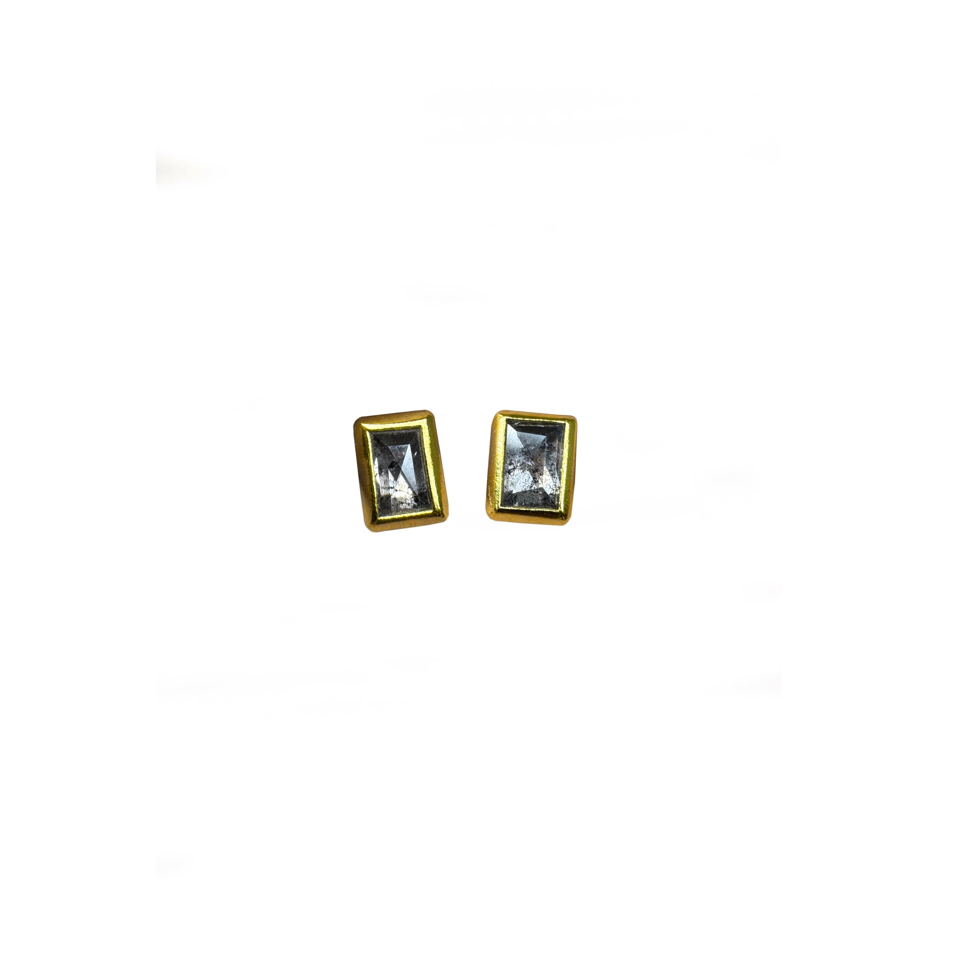 18k yellow gold pair stud earrings with 22k bezels set with rectangular shape rosecut gray diamonds.