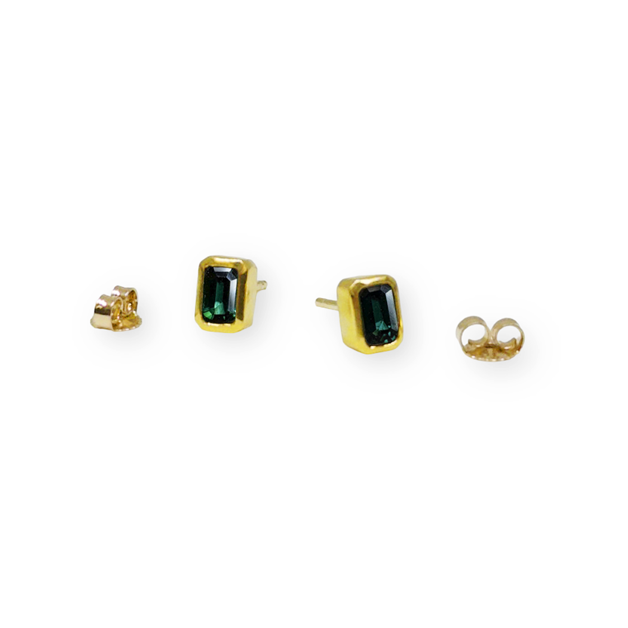 18k yellow gold stud earrings with 22k bezels set with rectangular tourmaline gemstones.