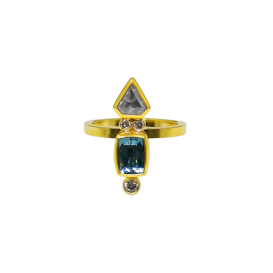 18k yellow gold Totem ring with 22k bezel set Tourmaline and Diamonds