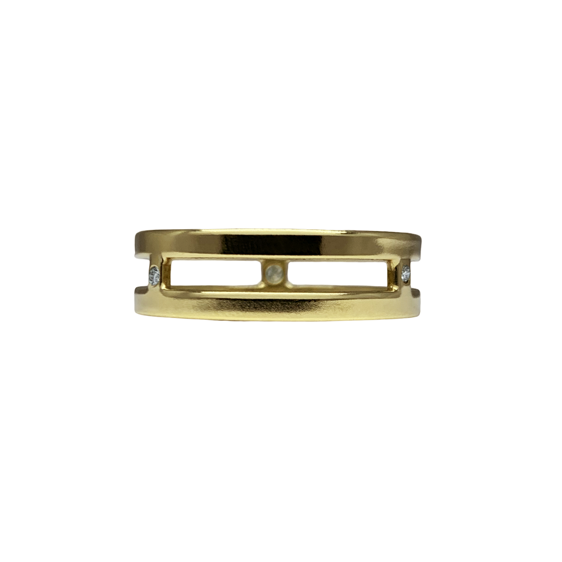 18k yellow gold band with three vertical bar stations each flush set with a small round diamond.