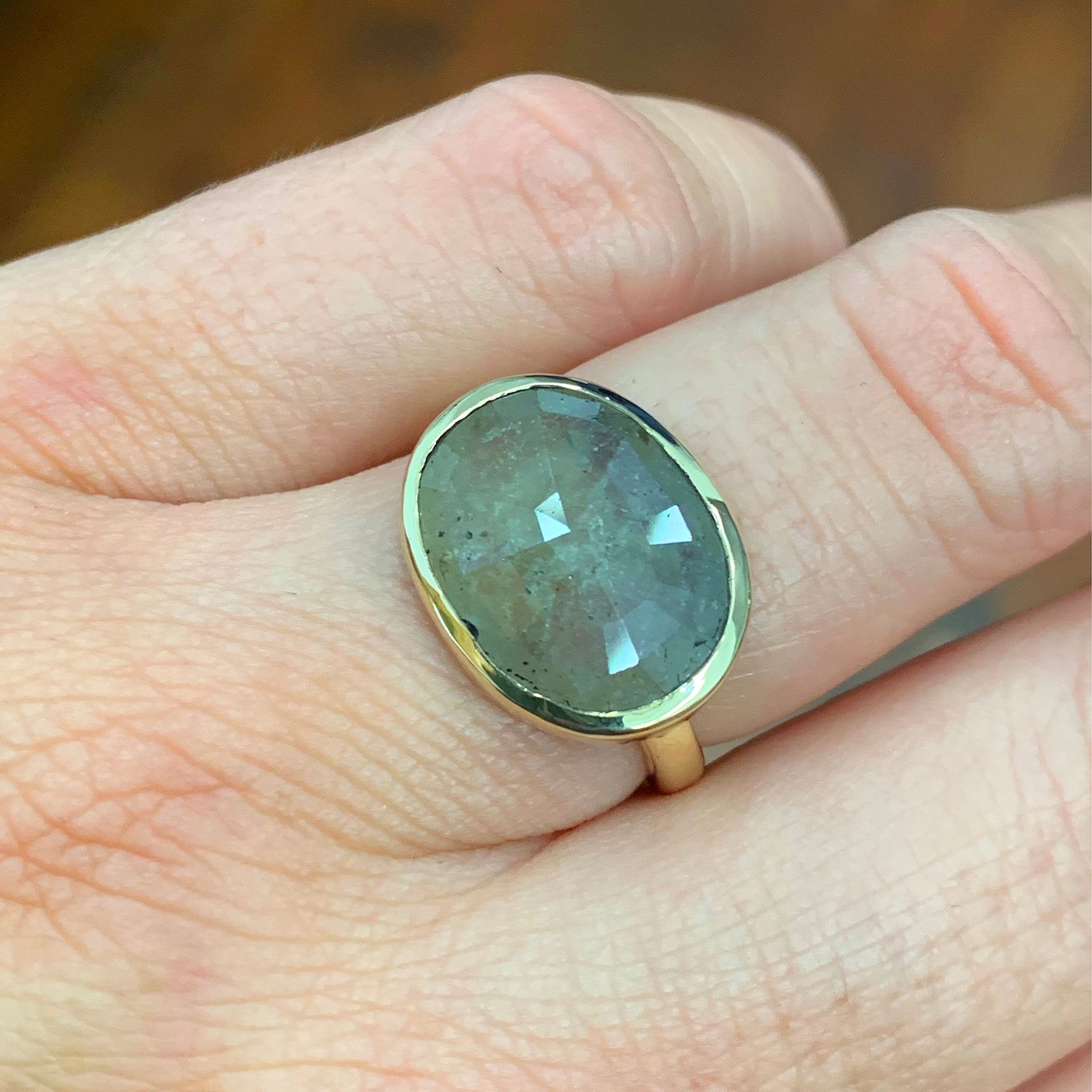 14k yellow gold ring featuring a bezel set oval rosecut light greenish-yellow sapphire.